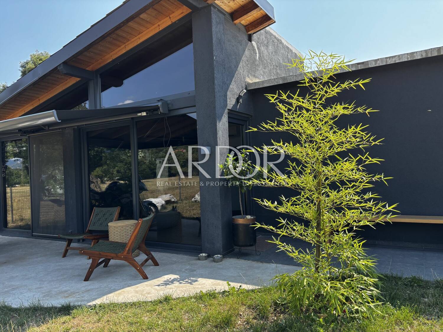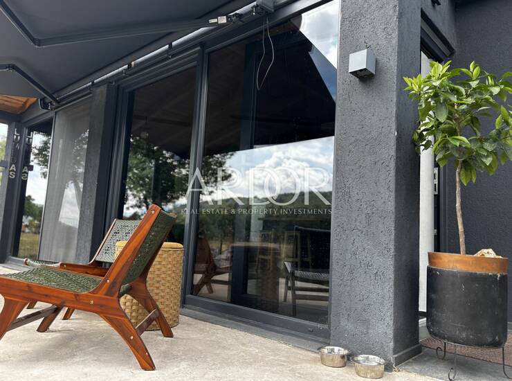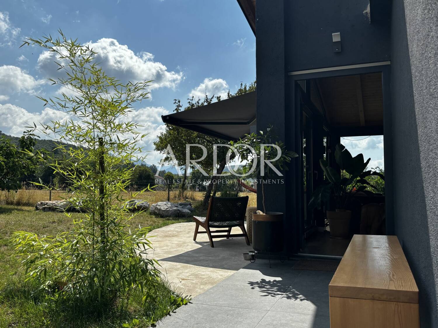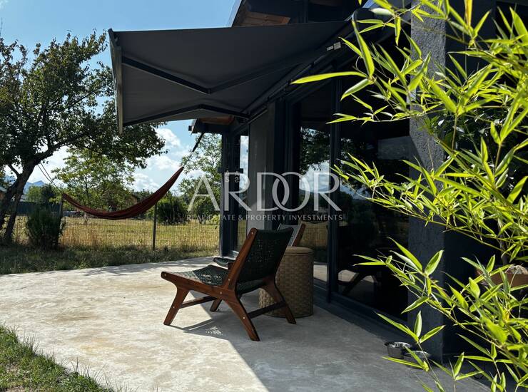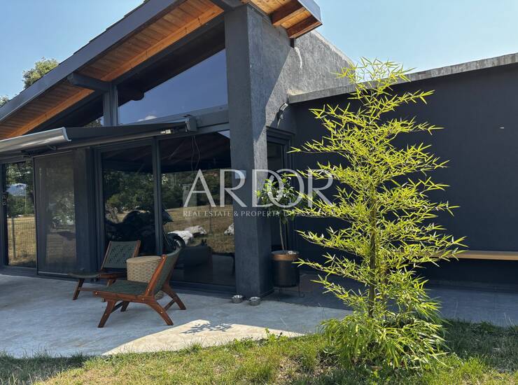 Za dugoročni najam nudi se jedinstvena kuća u Podhumu, površine 80 m², osmišljena u skladu s načelima minimalizma i prožeta prirodnim materijalima. Prostrani interijer čine dvije spavaće sobe, kupaonica te kuhinja povezana s prozračnim i svijetlim dnevnim boravkom. Klizna staklena stijena otvara prostor prema terasi i uređenom vrtu u kojem rastu bambus, masline, smokve i drenjule, pružajući pogled na mirno, zeleno okruženje. Poseban šarm domu daje namještaj, većinom ručno izrađen, dok dodatnu praktičnost osigurava garaža i vanjsko parkirno mjesto. Odlična prilika za idiličan život, udaljen od gradske vreve samo desetak minuta vožnje.