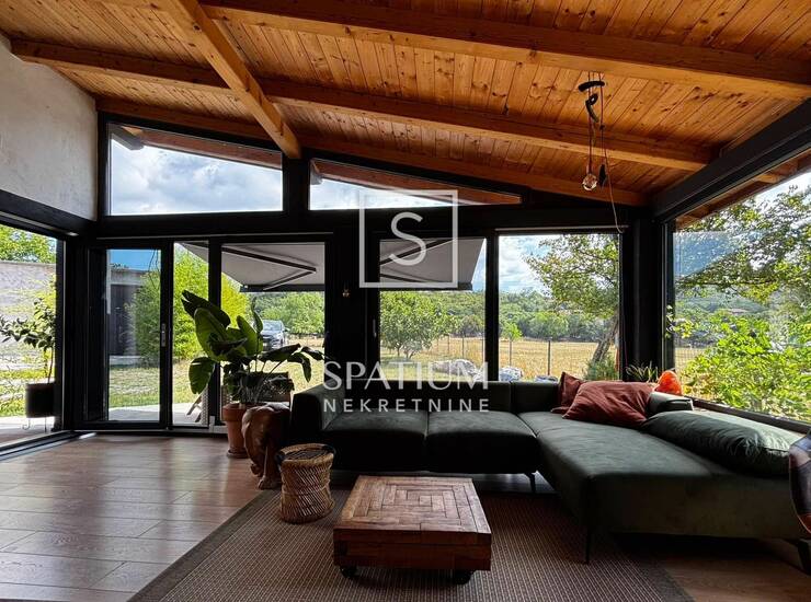 PODHUM, u ponudi imamo jedinstveni stan u kući površine 80 m², osmišljenoj u skladu s načelima minimalizma i prožeta prirodnim materijalima. Prostrani interijer čine dvije spavaće sobe, kupaonica te kuhinja povezana s prozračnim i svijetlim dnevnim boravkom. Klizna staklena stijena otvara prostor prema terasi i uređenom vrtu u kojem rastu bambus, masline, smokve i drenjula, pružajući pogled na mirno, zeleno okruženje. Poseban šarm domu daje namještaj, većinom ručno izrađen, dok dodatnu praktičnost osiguravaju vanjska parkirna mjesta, privatnost, mir, idealno za manju djecu i sigurno okruženje za kućne ljubimce.