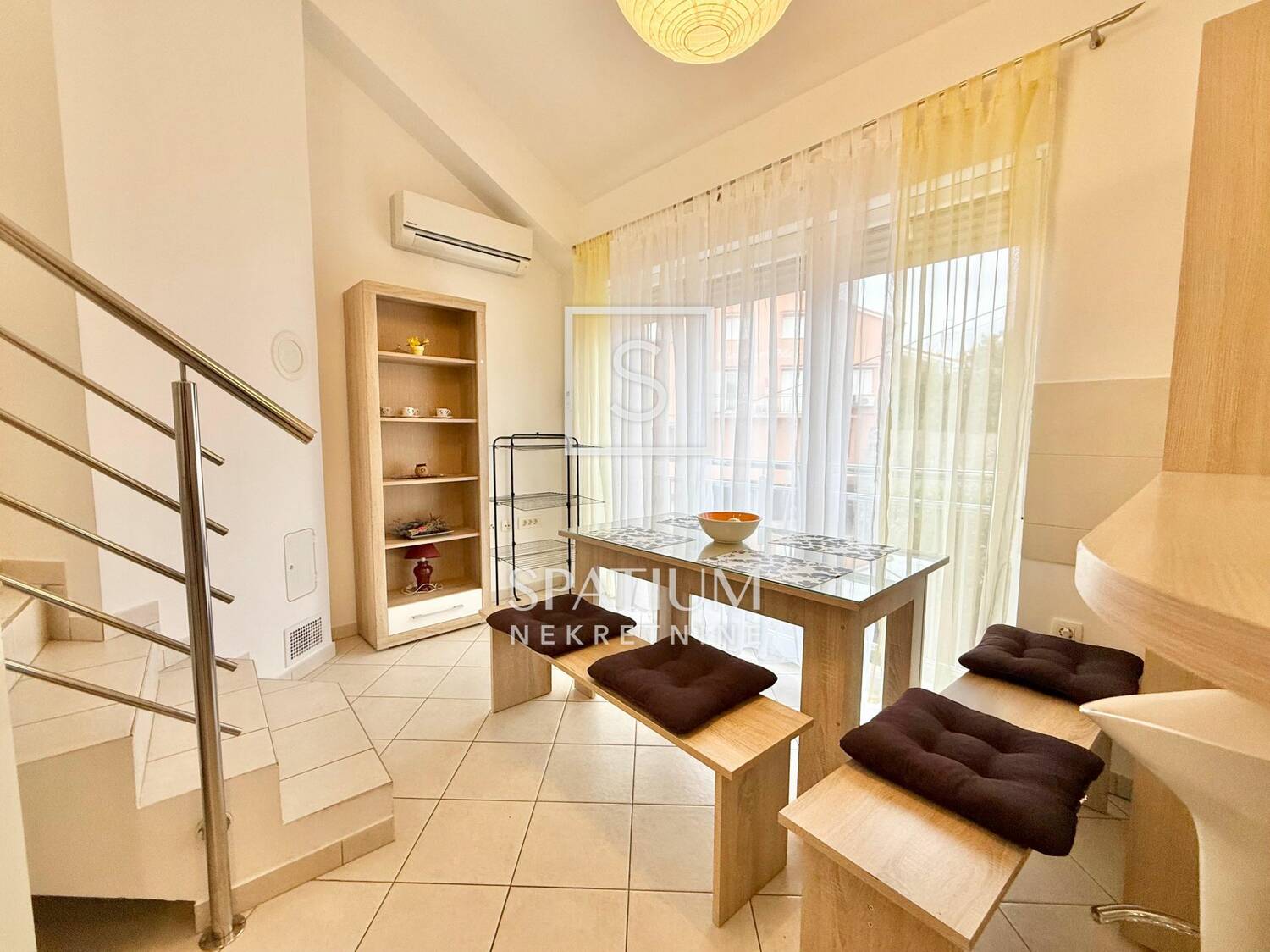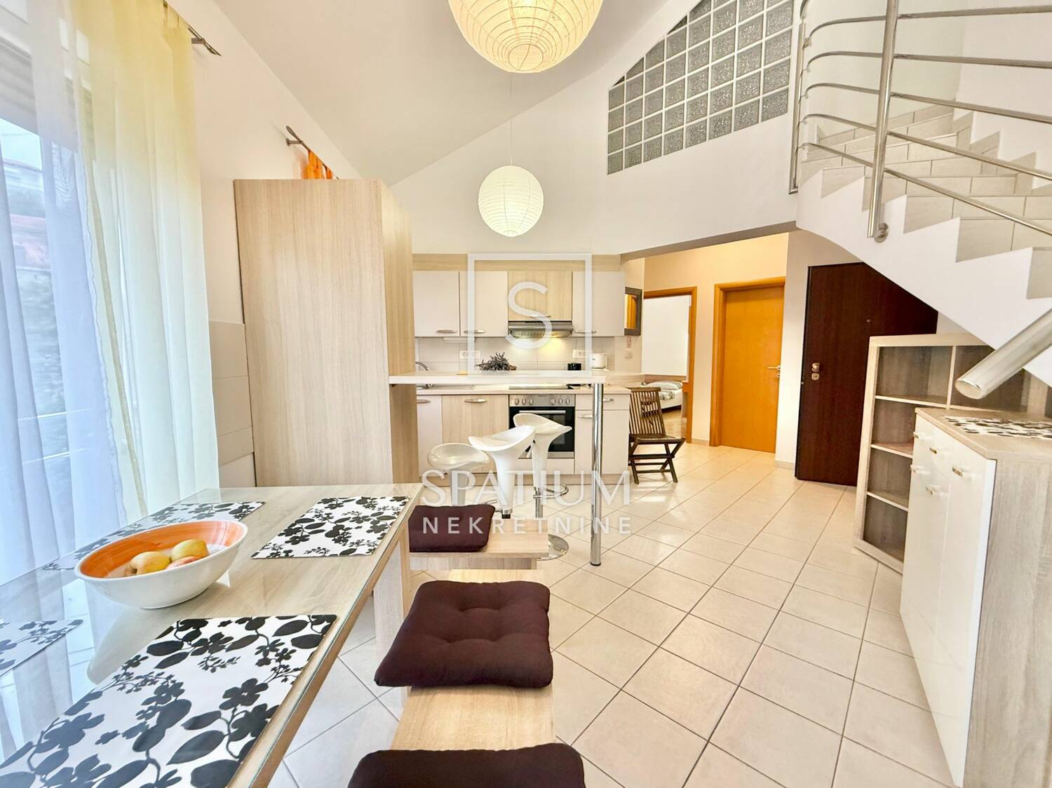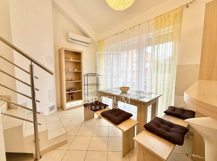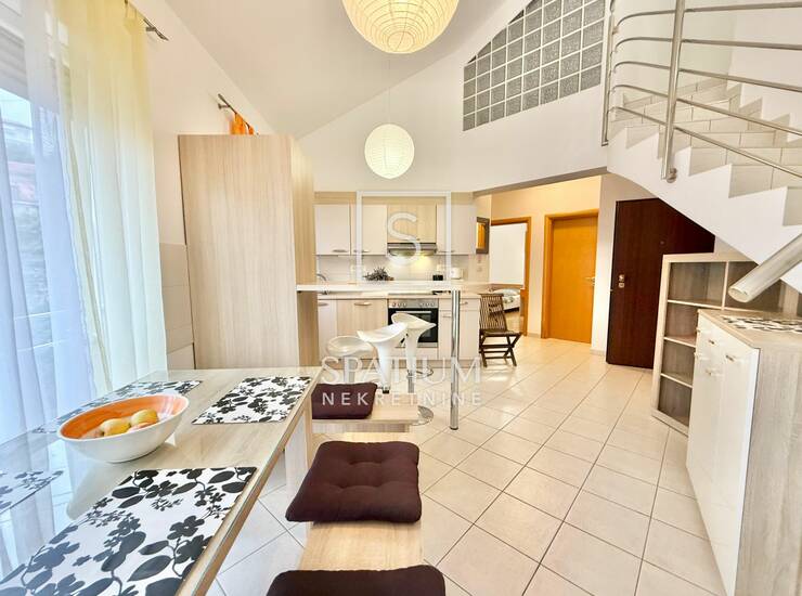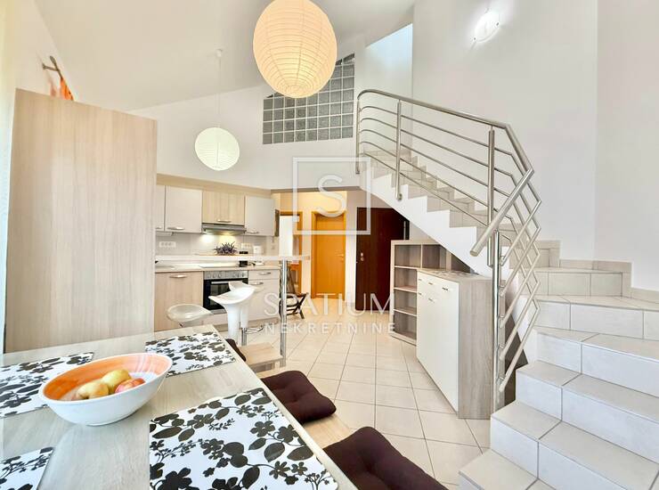 Na prvoj etaži stan se sastoji od prostrane kuhinje s balgovaonicom, dvije spavaće sobe, i kupaonice. Stepenicama se dolazi na gornju etažu, gdje se nalazi još jedna spavaća soba s valstitom kupaonicom te veliki dnevni boravak.