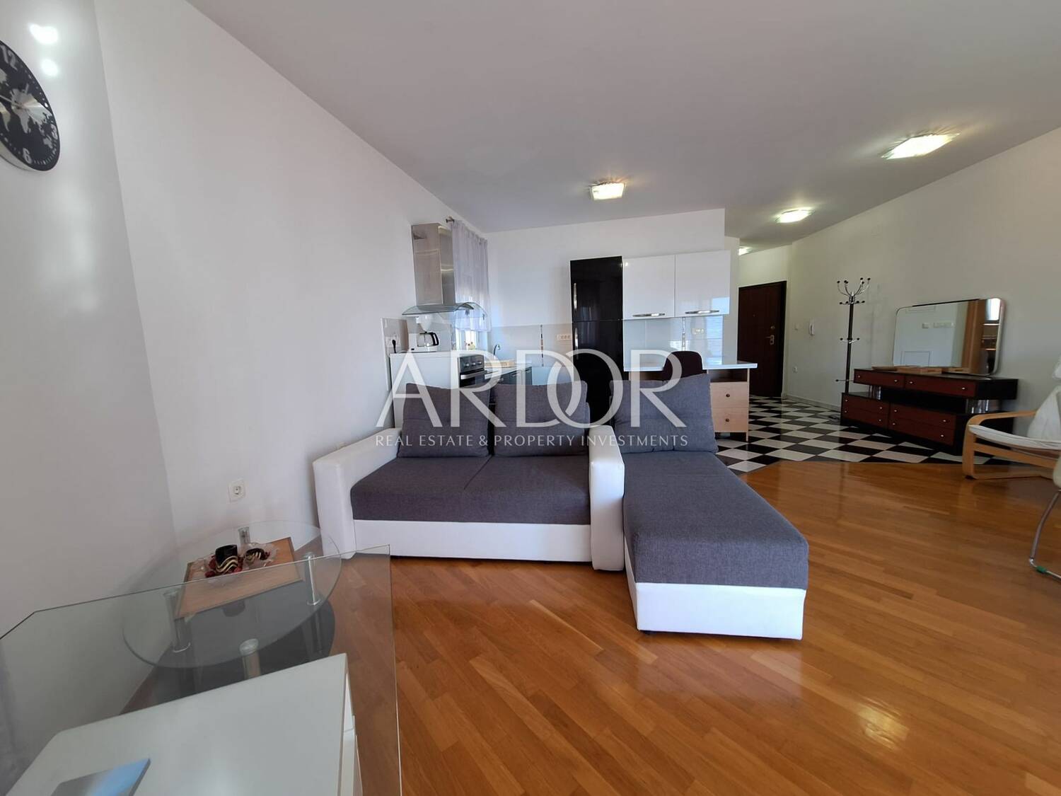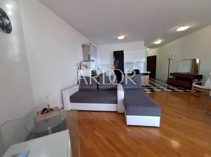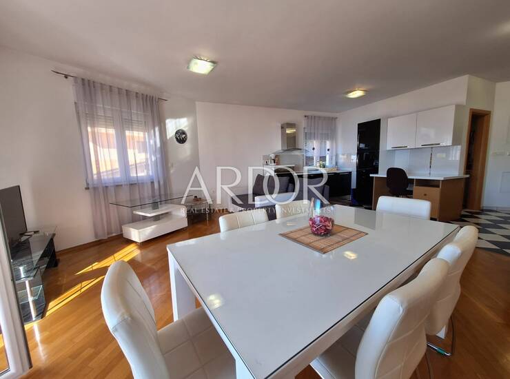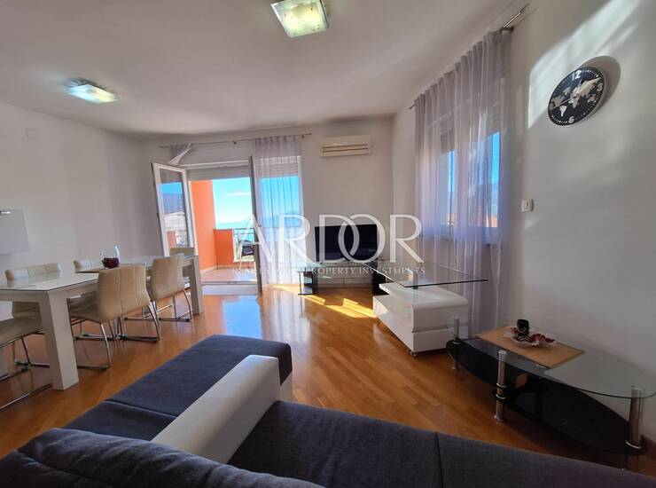 Dominantni dio stana čini veliki open-space dnevni boravak povezan s kuhinjom i blagovaonicom, iz kojeg se izlazi na prostrani balkon s prekrasnim pogledom na more i okolinu. Prostor je izuzetno svijetao, prozračan i moderan, idealan za opuštanje ili druženje.