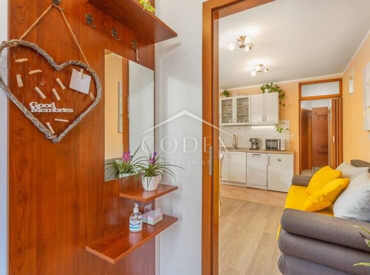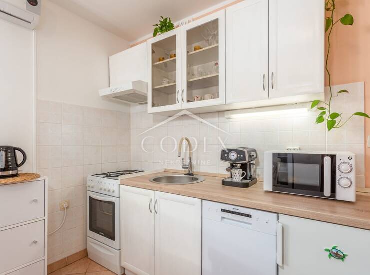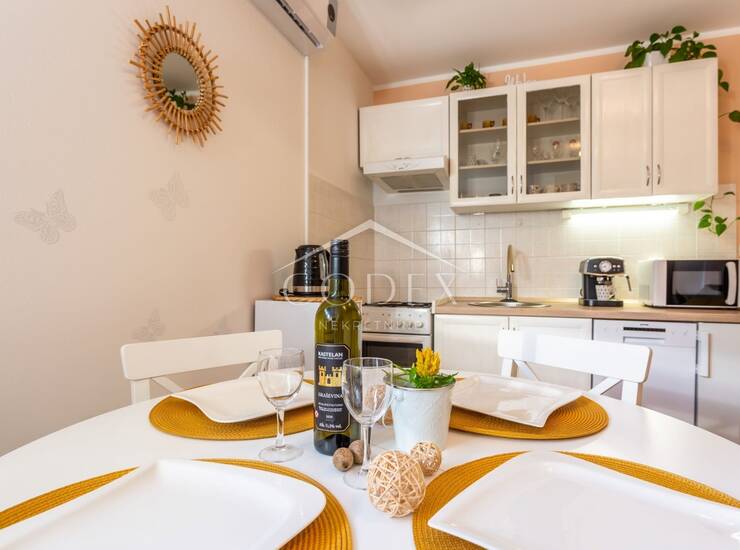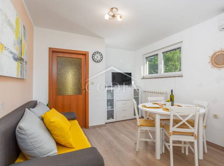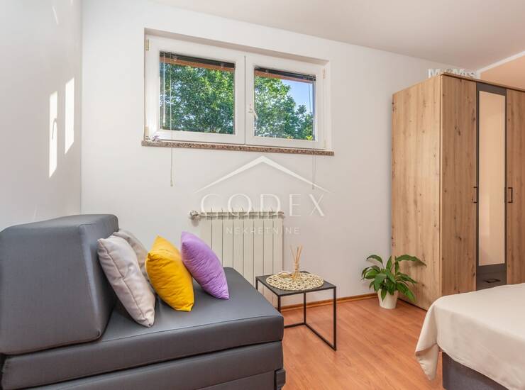 Ovaj moderan i potpuno namješten stan za najam nalazi se u prizemlju kuće, idealan za dvočlane obitelji, studente ili poslovne ljude. S obzirom na funkcionalan raspored, stan se sastoji od prostrane kuhinje koja je povezena s dnevnim boravkom, jedne spavaće sobe te kupaonice. Tu je i mala ostava koja pruža dodatni prostor za pohranu.