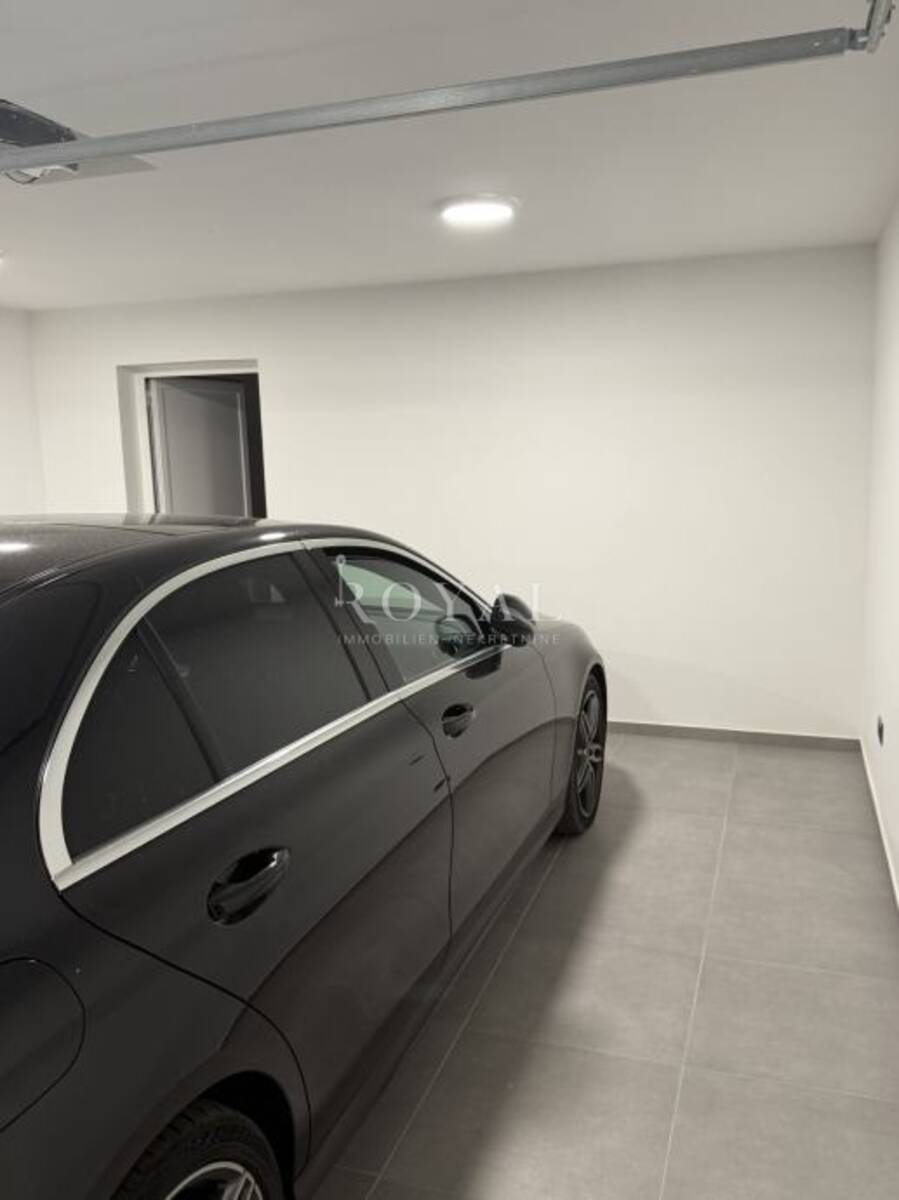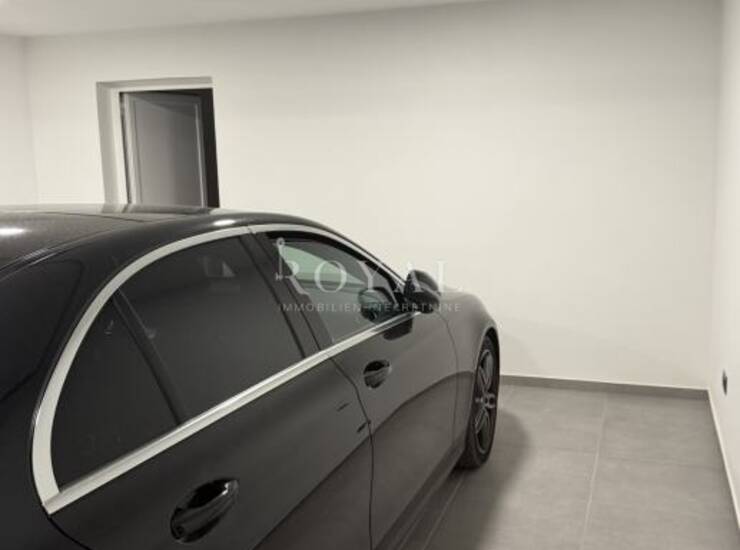 - velika garaža, konoba i veliko spremište. Unutarnjim stepenicama se dolazi u prizemlje koje se sastoji od jedne gostinske sobe, prostranog dnevnog boravka sa kuhinjom i blagovaonom s kojih je direktan izlaz prema bazenu i ljetnoj kuhinji. U istoj etaži se nalazi i utility sa praonom i wc-om.
