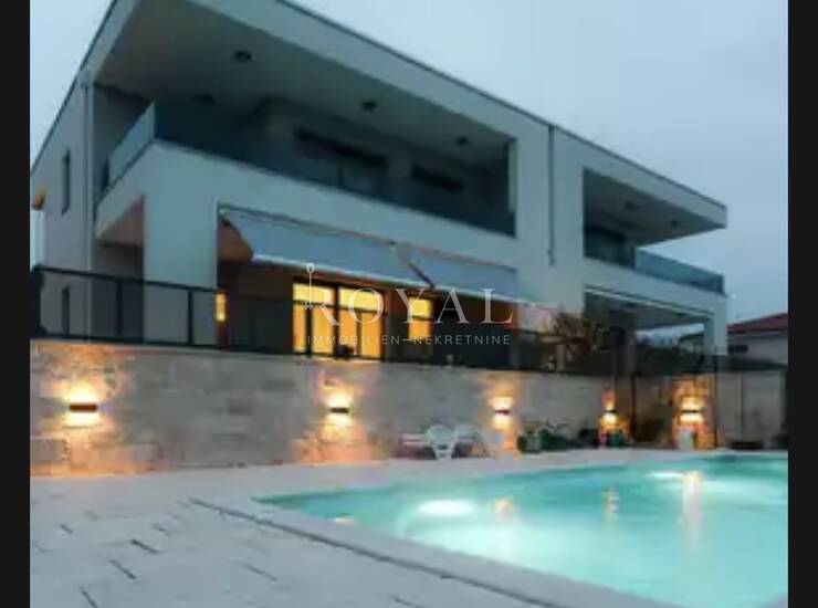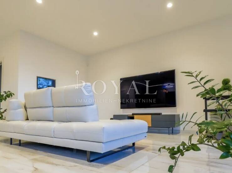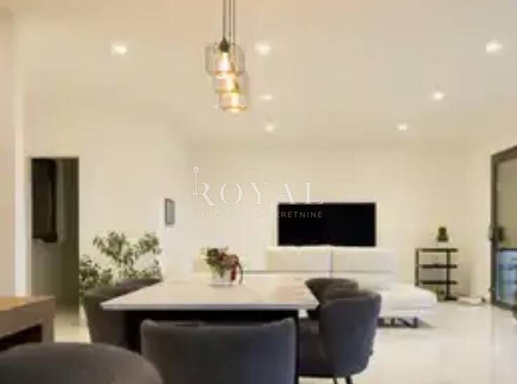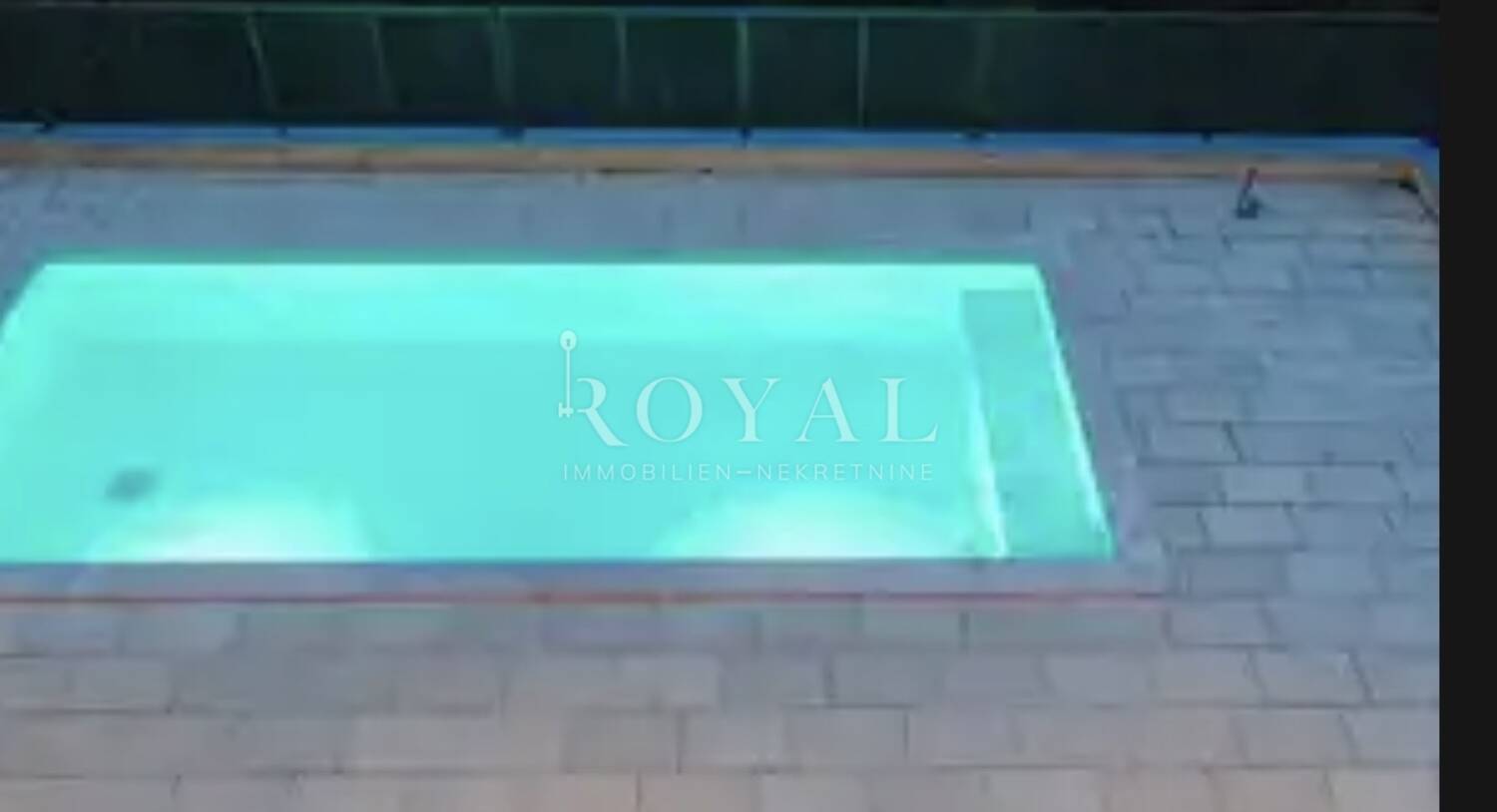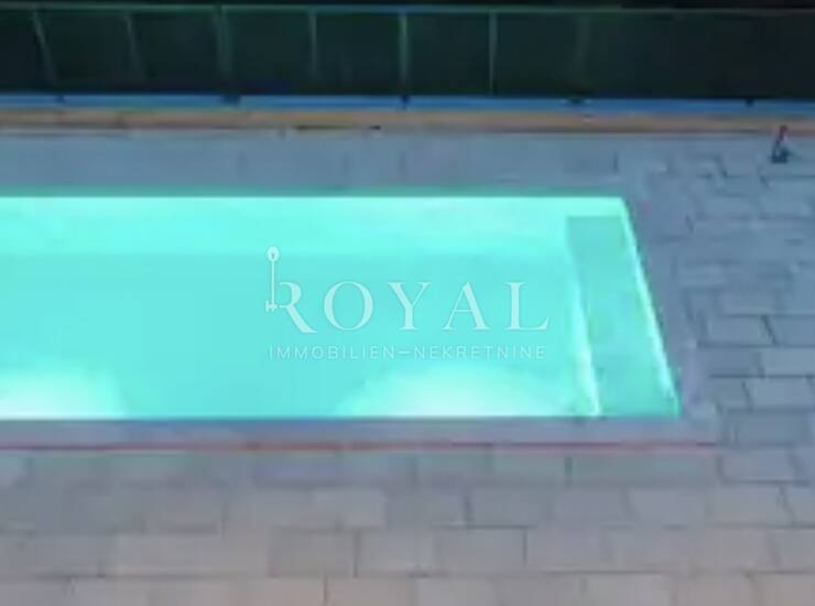 U suterenu se nalazi garaža za 2-3 vozila, vešeraj, unutarnjim stubištem dolazi se do prizemnog dijela stana gdje je smješten dnevni dio stana koji se sastoji od kuhinje sa blagovaonom , veliki dnevni boravak te wc. Iz prizemlja postoji mogućnost izlaza na okućnicu na kojoj je bazen i sunčalište.