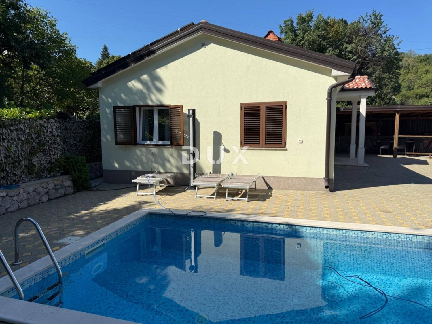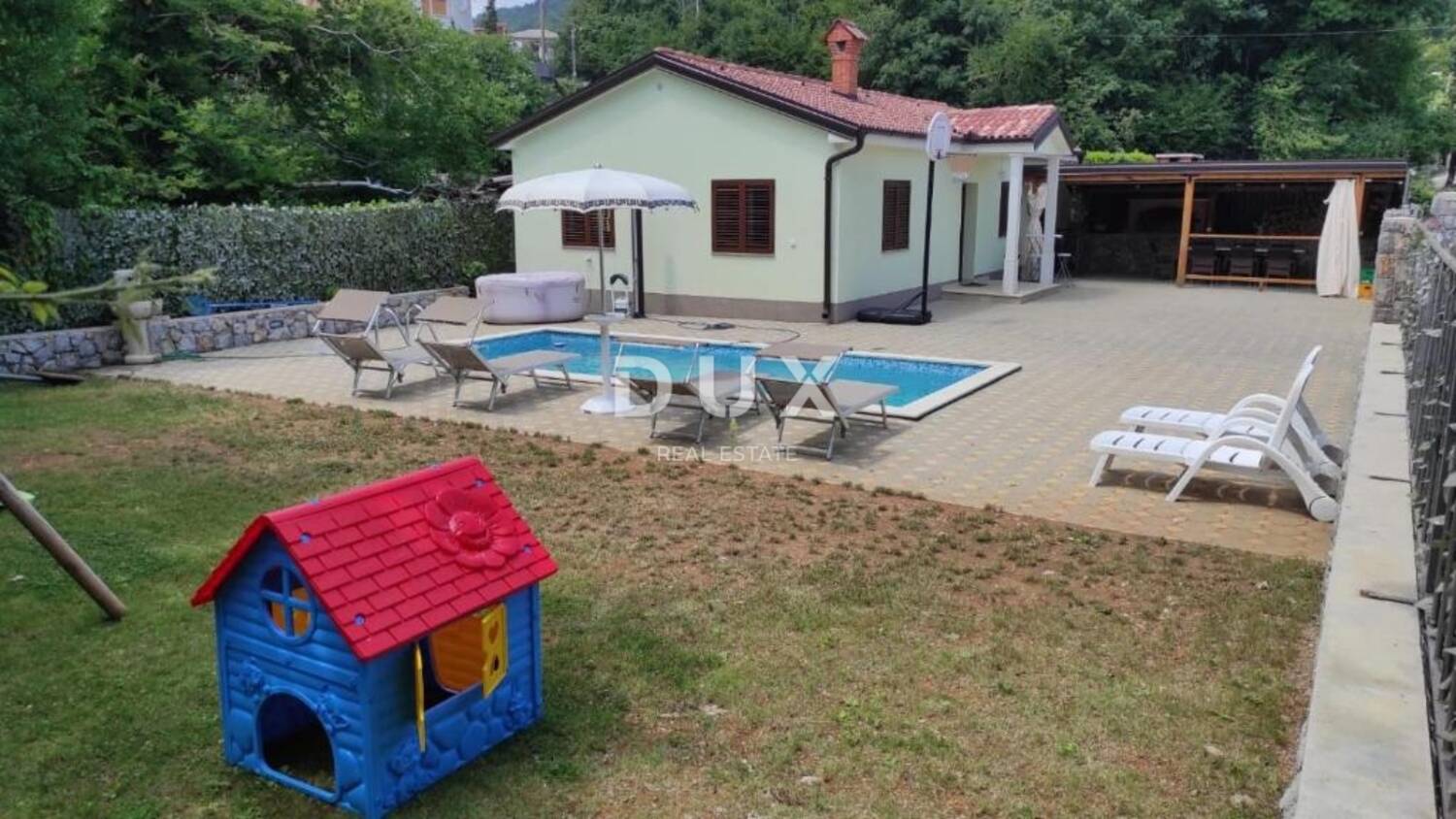 Iznajmljujemo ovu lijepu i kompletno namještenu samostojeću kuću s bazenom na mirnoj lokaciji, okružena zelenilom.