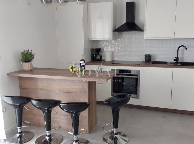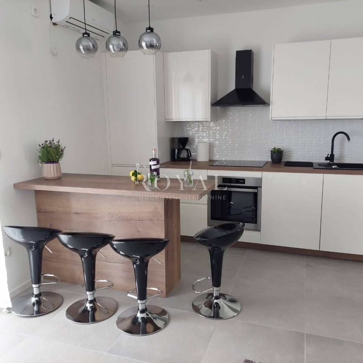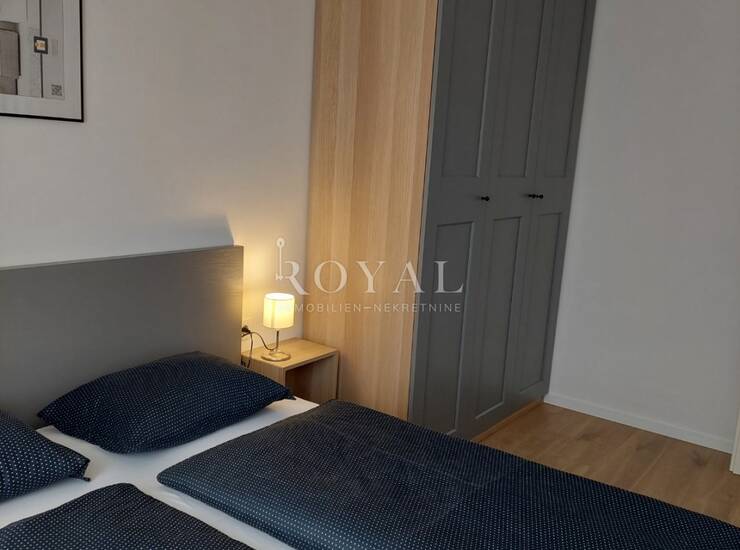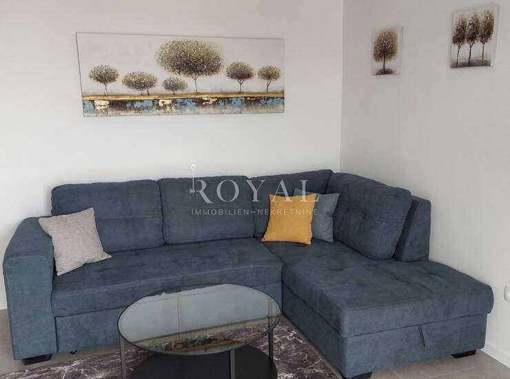 Stan se sastoji od dnevnog boravka, blagovaonice, dvije spavaće sobe te terase s prekrasnim pogledom na more. Uredan je, održavan i opremljen svim potrebnim namještajem i uređajima. Grijanje je etažno centralno, uz dodatnu mogućnost grijanja i hlađenja putem klima uređaja.