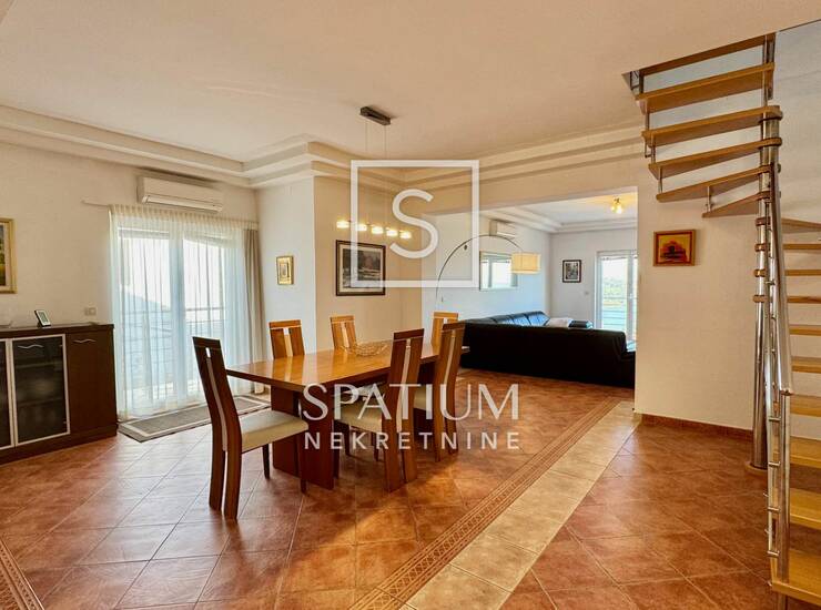Na prvoj etaži stana nalazi se opremljena kuhinja uz koju je smještena kupaonica. Središnjim prostorom etaže dominira veliki blagovaonski stol.