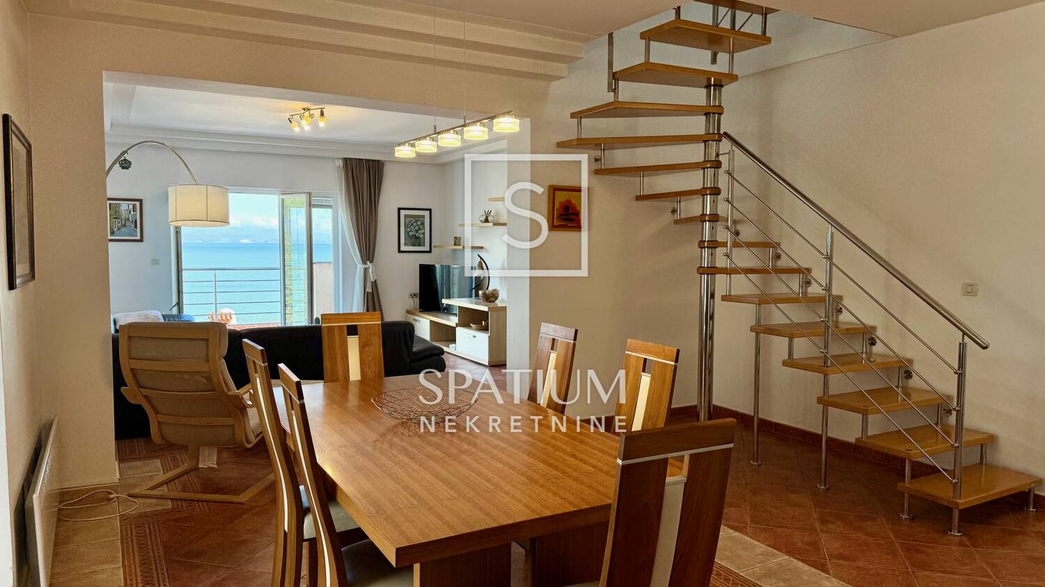 U dnevnom boravku nalazi se prostrana sjedeća garnitura prikladna za veći broj osoba. Iz dnevnog boravka izlazi se na balkon s kojeg se pruža otvoreni pogled na more.