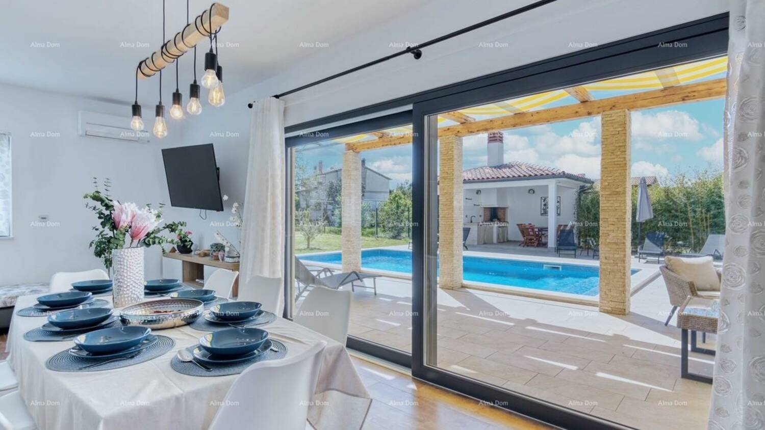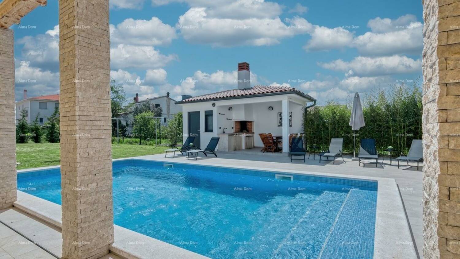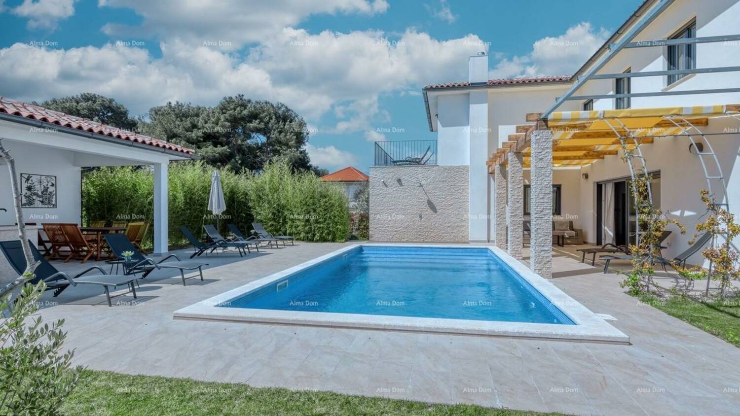 Iznajmljuje se prostrana, svijetla i moderno uređena vila, idealna za opuštajući i bezbrižan boravak obitelji ili prijatelja. Vila je posebno osmišljena s naglaskom na boravak na otvorenom te nudi privatni bazen, veliku sunčanu terasu, natkrivenu i otvorenu terasu s blagovaonicom i roštiljem, kao i ugodnu sjenovitu lounge zonu smještenu ispred dnevnog boravka.