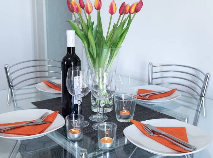 Jugoistočne je orijentacije, izuzetno svijetao i ugodan za boravak, s lijepim pogledom na more. Stanu pripada i jedno osigurano parkirno mjesto.