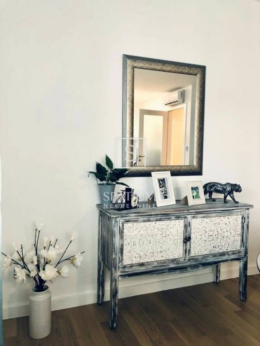 Stan se sastoji od ulaznog prostora, kuhinje s blagovaonicom i dnevnim boravkom, kupaonice, spavaće sobe i balkona. Moderno je opremljen a grijanje je podno u kombinaciji s klima uređajem.