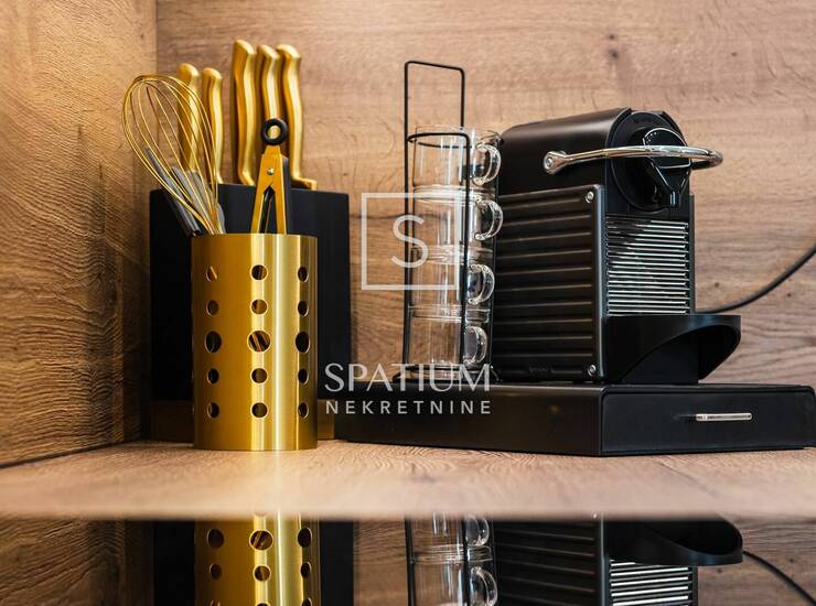 Stan se sastoji od ulaznog prostora, kuhinje s blagovaonicom i dnevnim boravkom, kupaonice te spavaće sobe s garderobom. Potpuno je renoviran i luksuzno opremljen te je osposobljen kao smart home. Južne je orijentacije tako da je pun dnevne svjetlosti. Tu su i dva TV-a sa sound sistemom, optički internet i dvije inverter klima jedinice. Iako u samom centru, uz stan dolazi i parkirno mjesto.