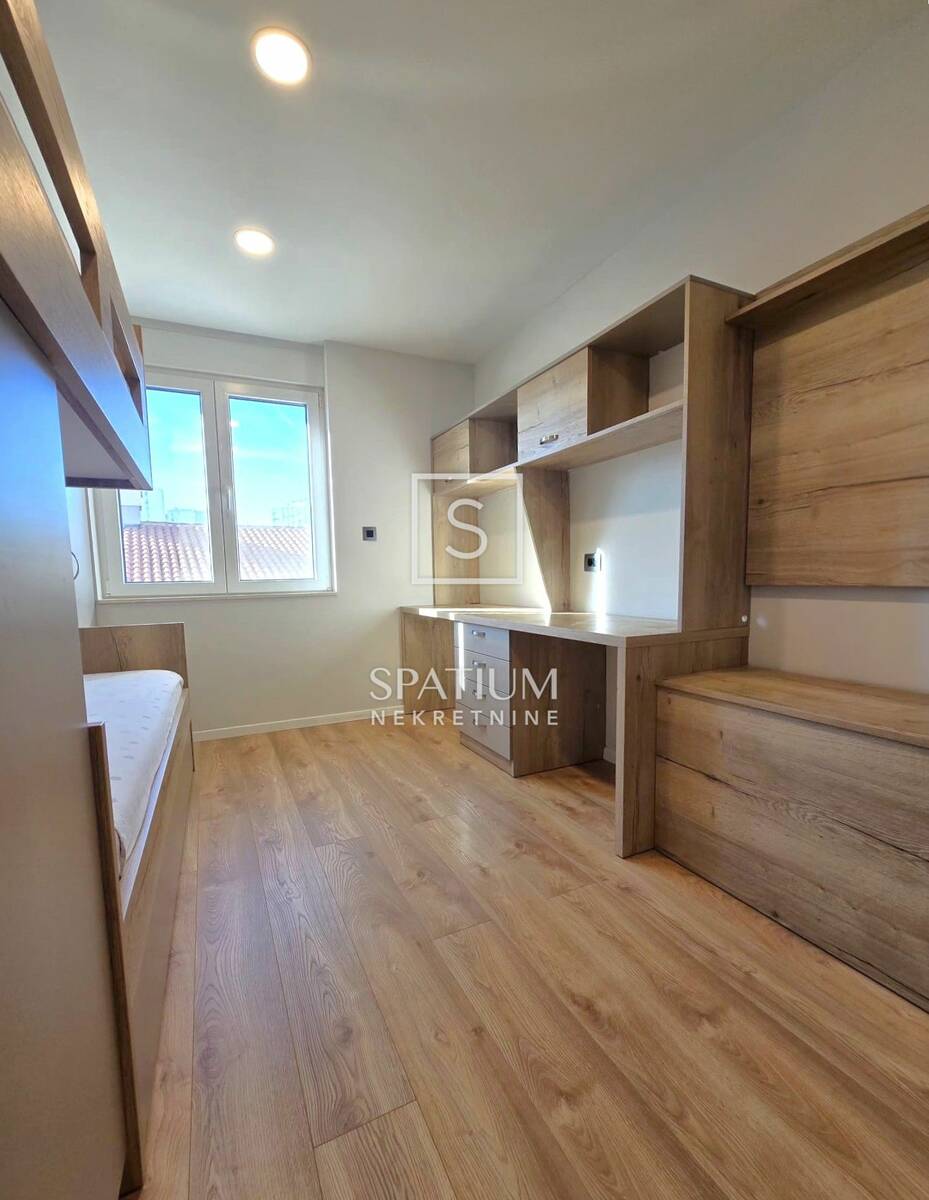 DONJA VEŽICA, u ponudi za dugoročni najam je dvosoban stan s dnevnim boravkom, površine 62,40 m2. Odličnog je rasporeda, kompletno adaptiran te dijelom namješten kvalitetno izrađenim namještajem po mjeri. Sastoji se od dvije spavaće sobe, kupaone, hodnika i dnevnog boravka s kuhinjom i blagovaonom. Iz dnevnog dijela izlazi se na zatvorenu, infracrvenom grijalicom grijanu lođu koja je tako i zimi pogodna za boravljenje.