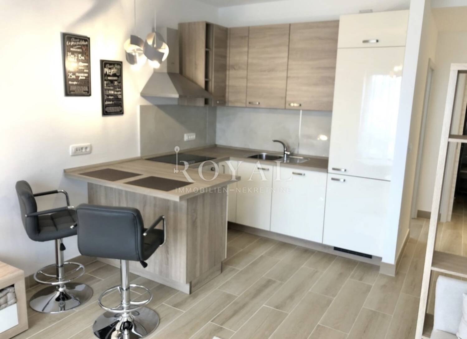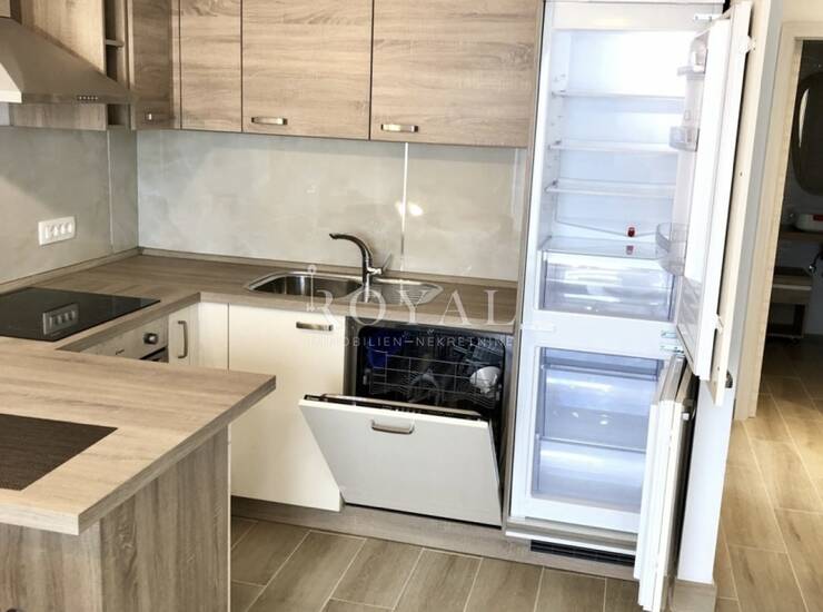 Sastoji se od dnevnog boravka sa kuhinjom, spavaće sobe, manje radne sobe, kupaone i hodnika. Opremljen je sa protuprovalnim vratima, PVC stolarijom, perilicom sa sušilicom, suđericom, pećnicom, te hladnjakom sa zamrzivačem. U stanu su 2 TV prijemnika. Grijanje je na klimu i Vaillant električne radijatore. Sa balkona se pruža pogled na more i Učku, a u istom pogledu možete uživati i unutar stana s obzirom da ima velike prozore.