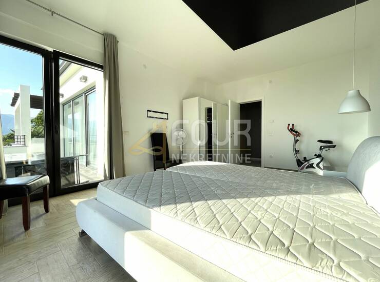 Iznajmljuje se prostrani, moderno uređen stan od 198,12m2 smješten u vili s prekrasnim pogledom na more. Stan se sastoji od tri spavaće sobe, od kojih jedna ima walk-in ormar, prostranog dnevnog boravka u otvorenom konceptu s kuhinjom i blagovaonicom, kupaonice, toaleta s pretprostorom za perilicu rublja i dodatnim spremištem, te hodnika. Vanjski zid dnevnog boravka je stakleni, pružajući izlaz na balkon i terasu s predivnim pogledom na more. Terasa se nalazi u dijelu kuhinje i blagovaonice, a balkon se proteže cijelom dužinom kuće, s izlazom iz dvije spavaće sobe i dnevnog boravka.