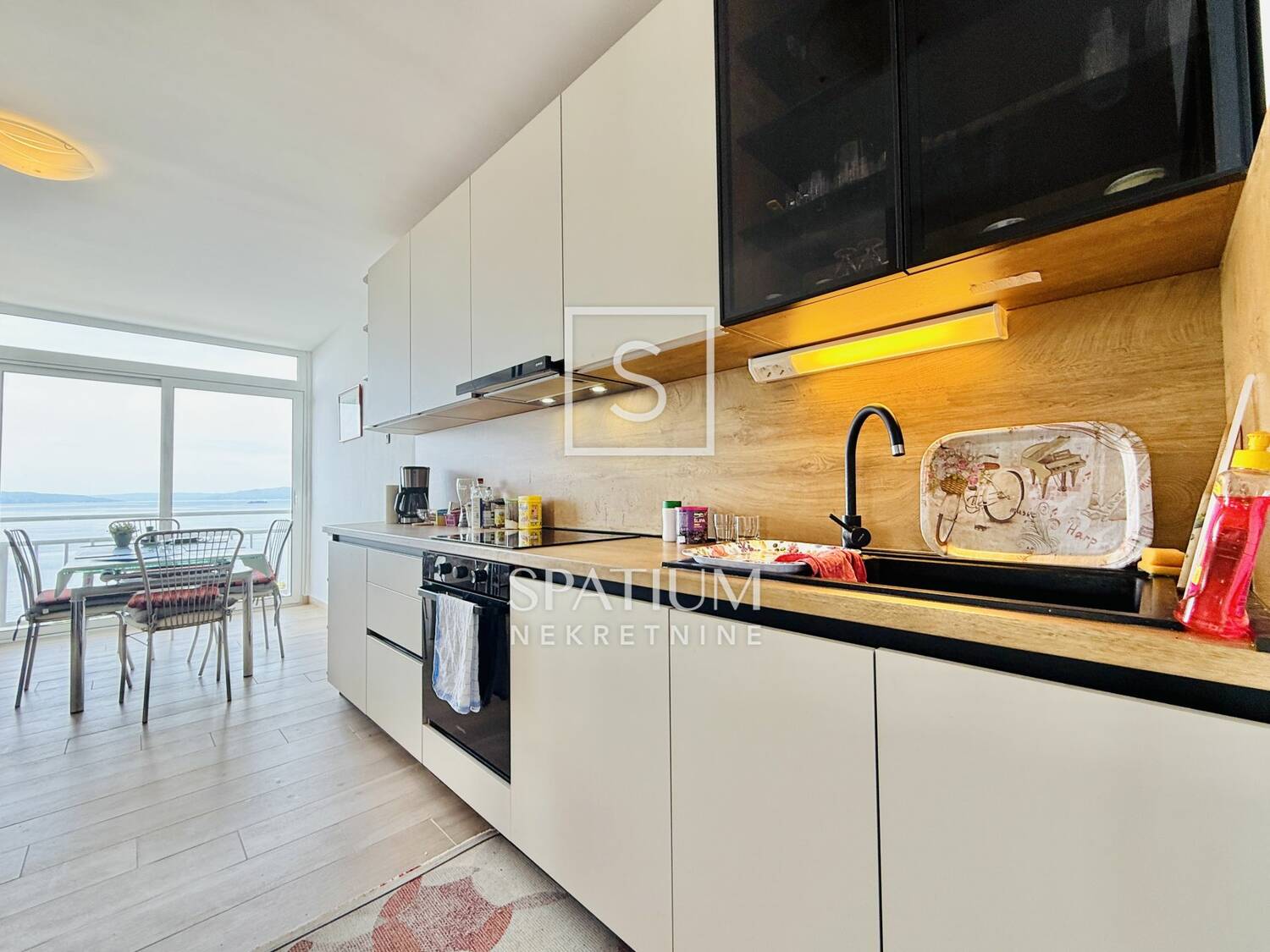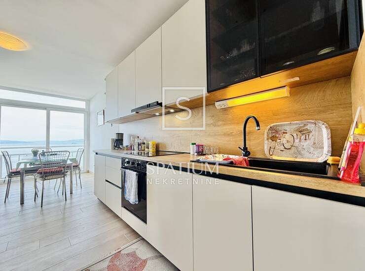 PEĆINE, u ponudi je osunčani moderan stan ukupne površine 80 m2. Sastoji se od otvorenog dnevnog boravka s kuhinjom i blagovaonicom, dvije spavaće sobe, kupaonice, toaleta, hodnika i smočnice. Iz dnevnog dijela i spavaće sobe izlazi se na loggiu s panoramskim pogledom na more. Sama nekretnina je kompletno adaptiran, kada su promijenjeni stolarija, instalacije vode i struje, podovi... Grijanje je centralno na plin te hlađenju dodatno pomažu dvije klima jedinice. Režije se plaćaju po potrošnji. Nalazi se u kvalitetnoj zgradi nadomak svih sadržaja: plaže, autobusne stanice, trgovine, trgovačkog centra, vrtića...