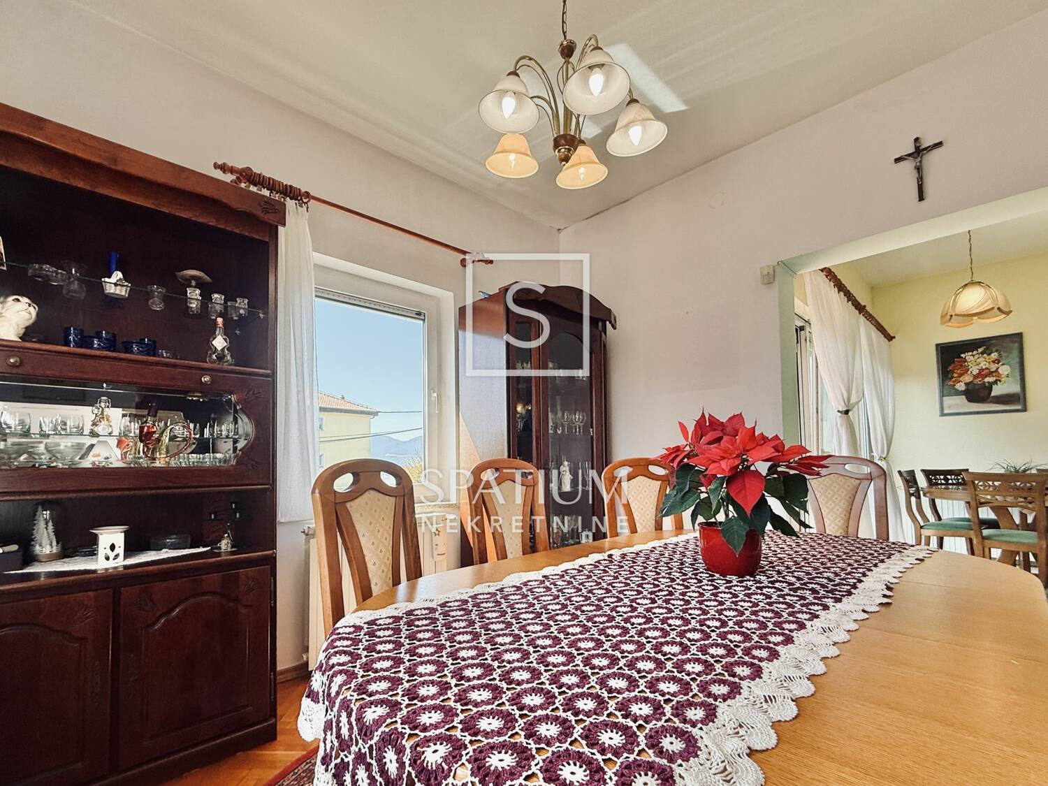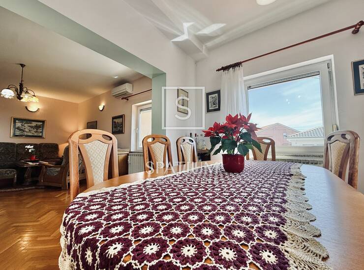 HOSTI, u ponudu smo dobili prostrani stan s okućnicom za dugoročni najam na mirnoj lokaciji. Ova nekretnina ukupne stambene površine 129,66 m² zauzima cijelu etažu kuće te se sastoji od hodnika, tri spavaće sobe, dvije kupaonice, velikog dnevnog boravka s izlazom na natkrivenu terasu s djelomičnim pogledom na more, kuhinje i dvije blagovaonice. Kuća ima centralno grijanje, dok je za hlađenje predviđena klima jedinica.