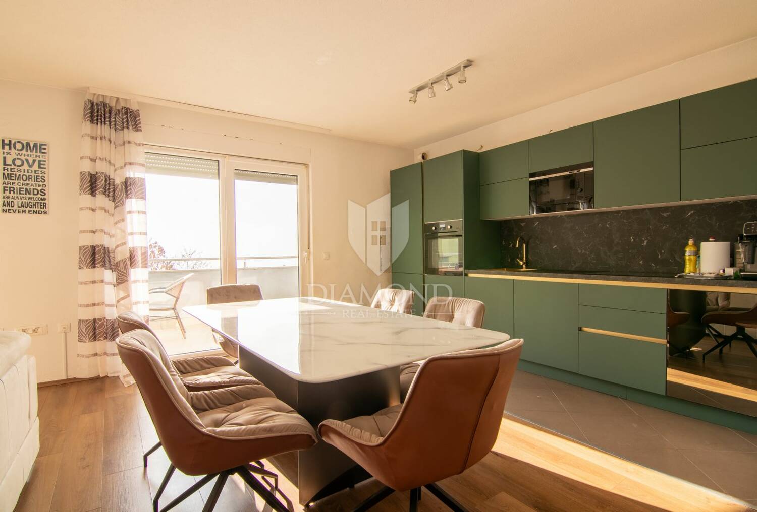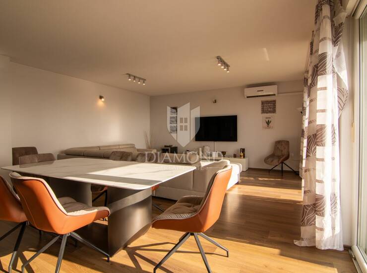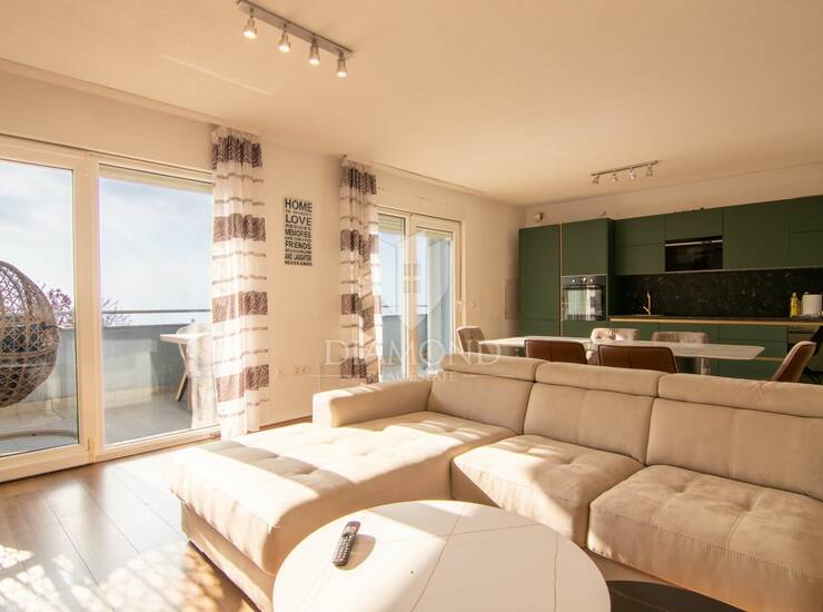 Stan se sastoji od prostranog dnevnog boravka s modernom kuhinjom i blagovaonicom, iz kojeg se izlazi na veliku sunčanu terasu s nevjerojatnim pogledom, idealnu za uživanje na otvorenom. Ima tri spavaće sobe, od kojih jedna također ima izlaz na terasu, prostranu kupaonicu te dodatni toalet.