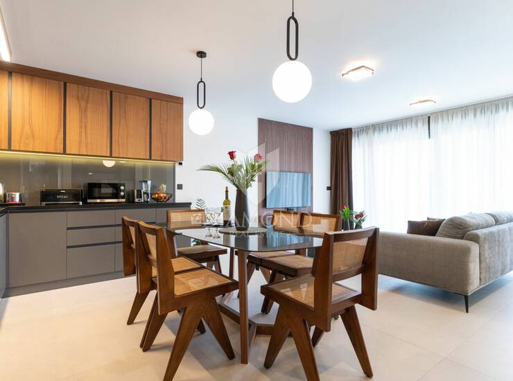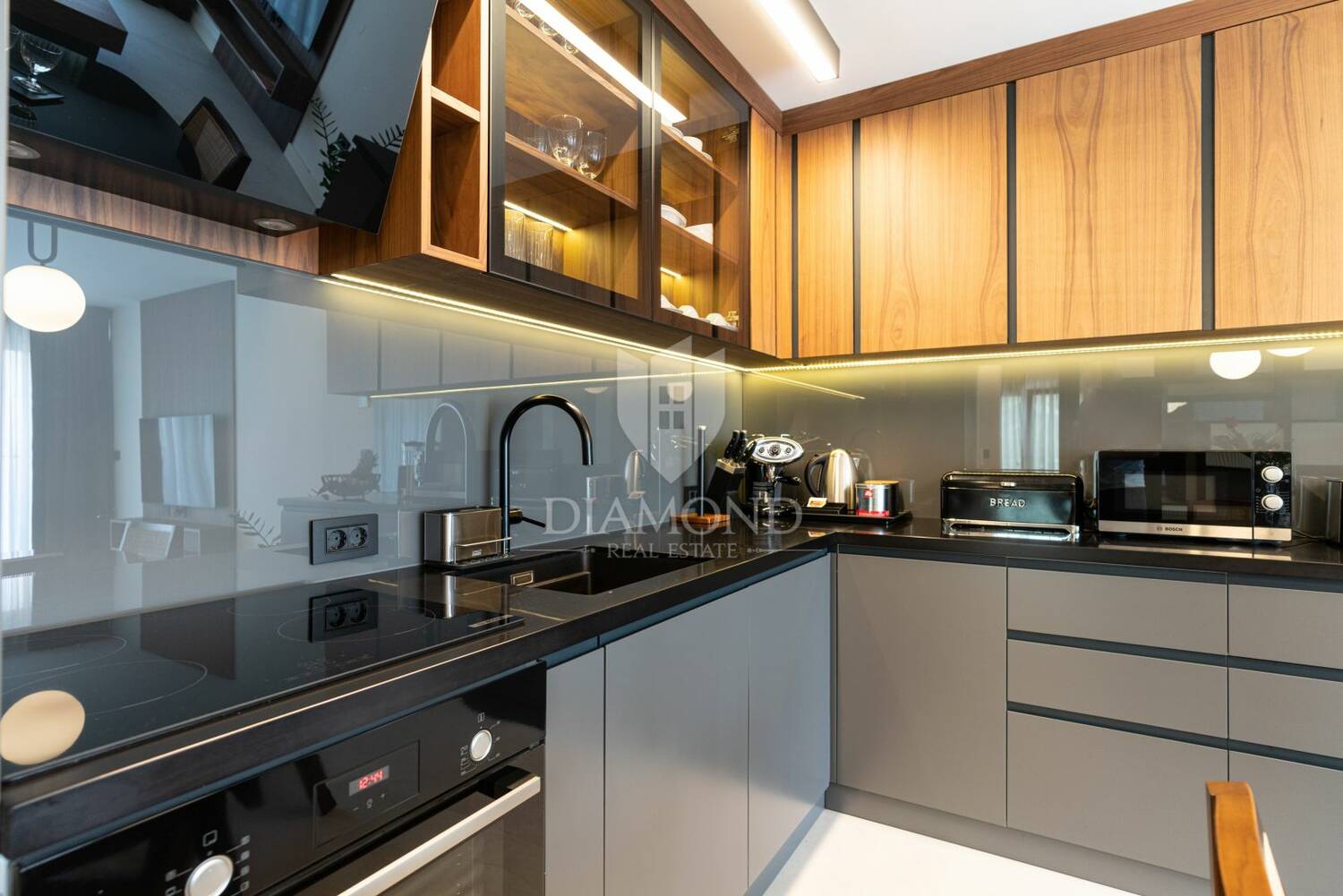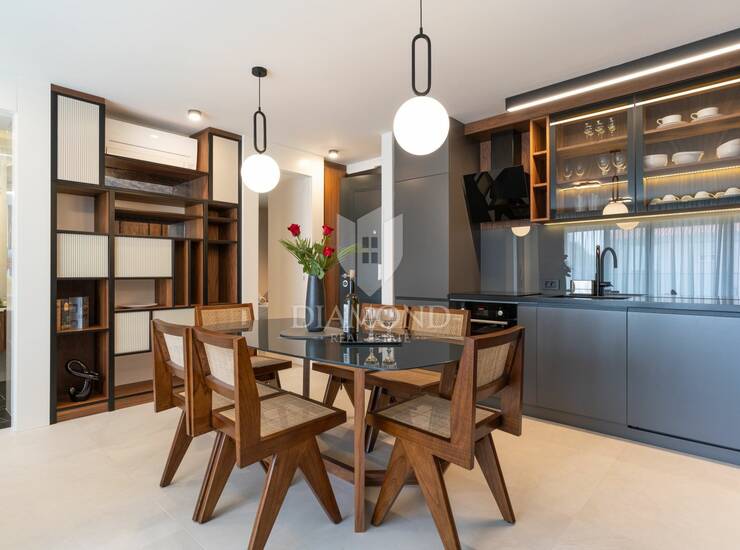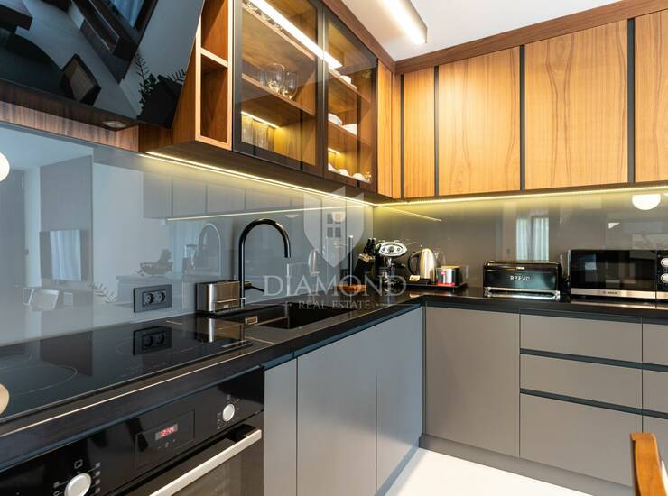 Posebna pažnja posvećena je kvaliteti opreme i završnih materijala. Stan je u potpunosti klimatiziran i opremljen uređajima renomiranih proizvođača poput Boscha i Samsunga, uključujući ploču za kuhanje, hladnjak, perilicu posuđa, perilicu rublja, mikrovalnu pećnicu te aparat za kavu. Kuhinju dodatno upotpunjuje Faber napa, dok kuhinjski inventar uključuje vrhunsko Villeroy & Boch posuđe, a cjelokupan interijer obogaćen je pažljivo od