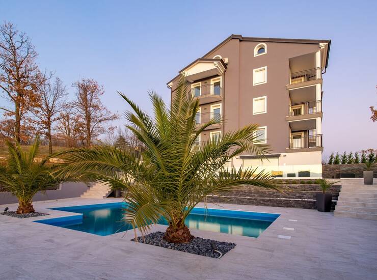 Stan za najam, luksuzno opremljeni na mirnoj lokaciji, od 85 m2. Zgrada sa 8 stanova sa pripadajućim parkingom i lijepo uređenim okolišem u kojem se smjestili bazen i velika natkrivena terasa.