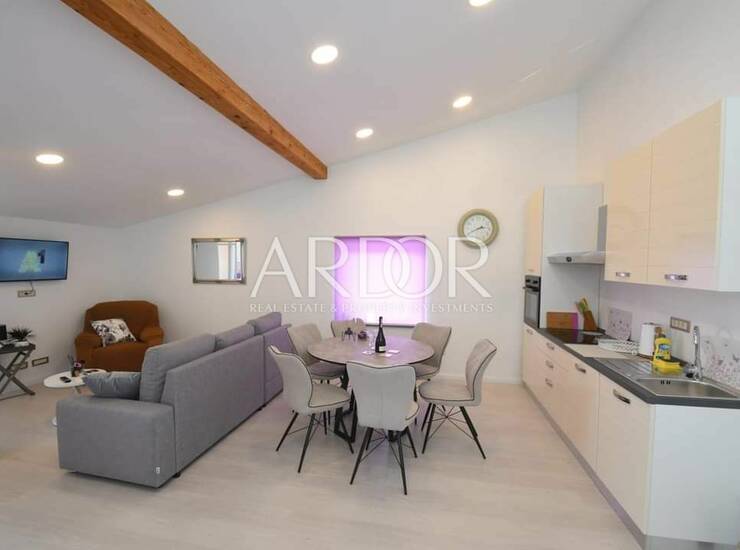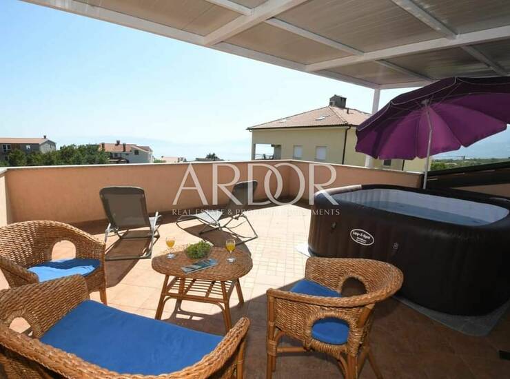 Kompletno opremljen i namješten stan površine 100 m², sa prostranom terasom od 30 m² s koje se pruža spektakularan pogled na Kvarnerski zaljev- savršeno mjesto za jutarnju kavu ili romantičnu večer pod zvijezdama.