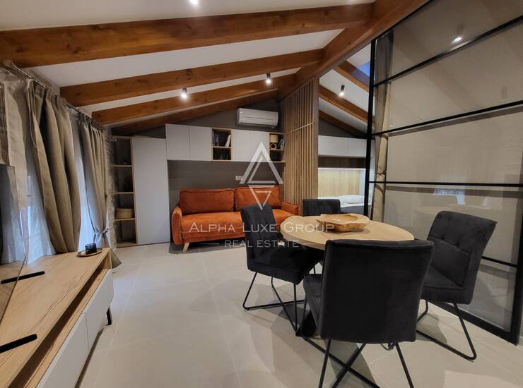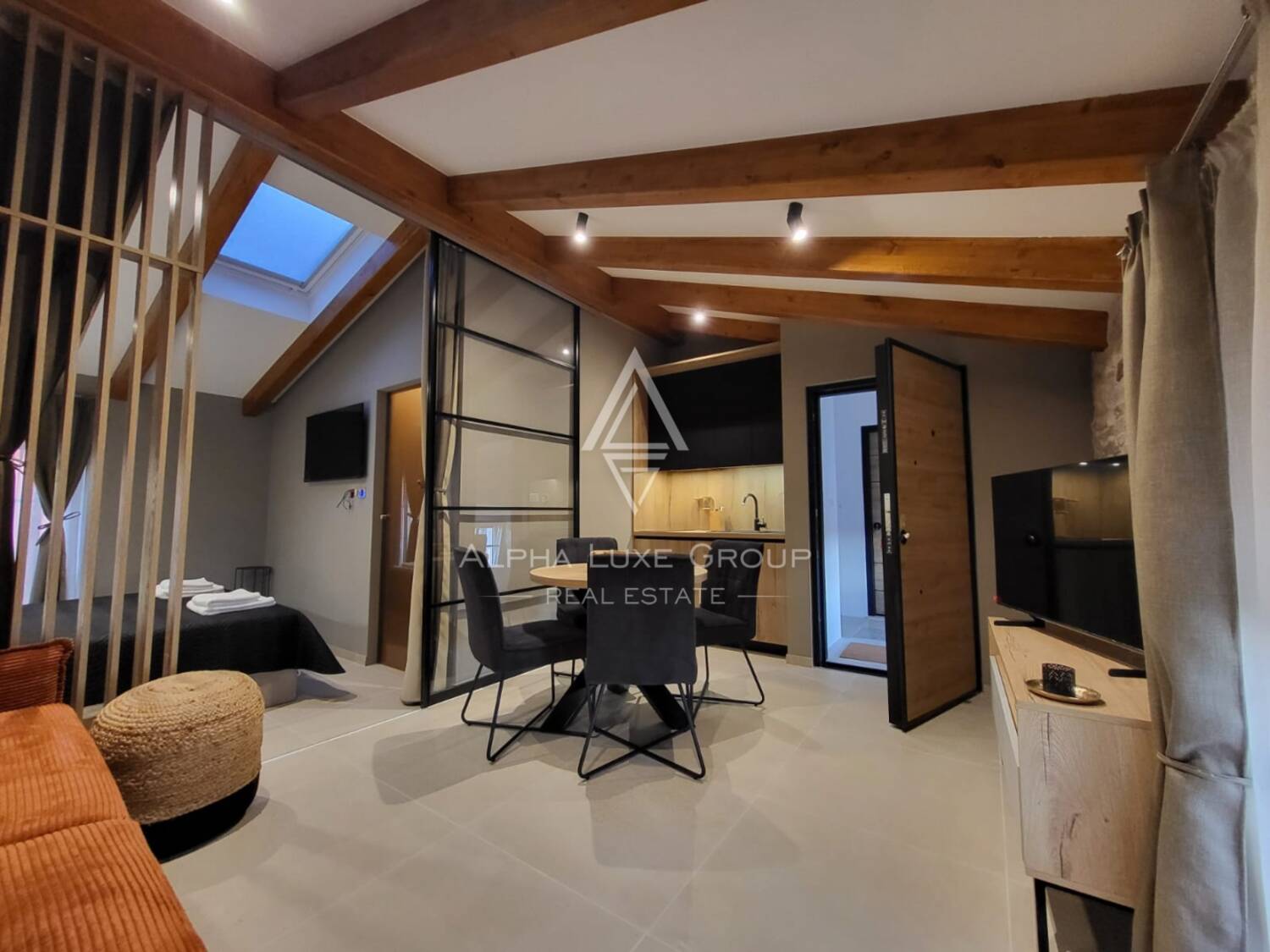 Prostor za spavanje smješten je u središnjem dijelu stana i diskretno je odvojen zavjesama, čime se stvara intiman i miran kutak za odmor. Drveni elementi u dizajnu i nježna ambijentalna rasvjeta dodatno naglašavaju ugodnu atmosferu prostora. Dnevni dio moderno je uređen i elegantno namješten te se prirodno nastavlja na kuhinju koja je kompaktna, ali potpuno funkcionalna i opremljena za svakodnevnu pripremu obroka.