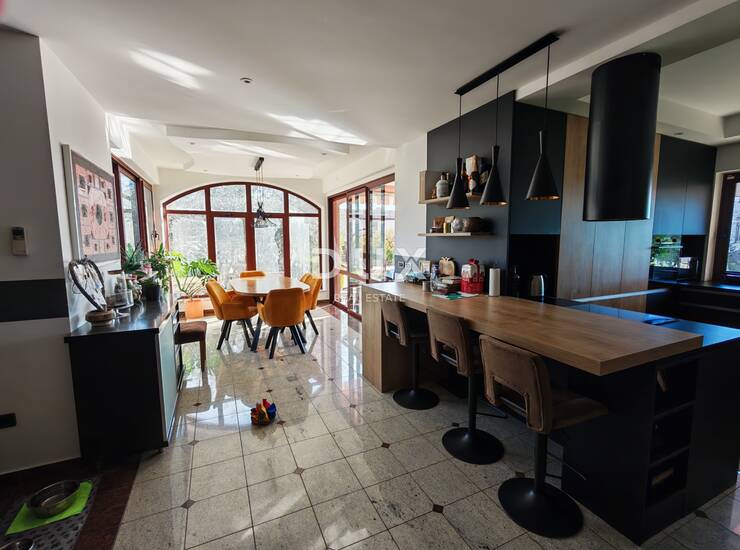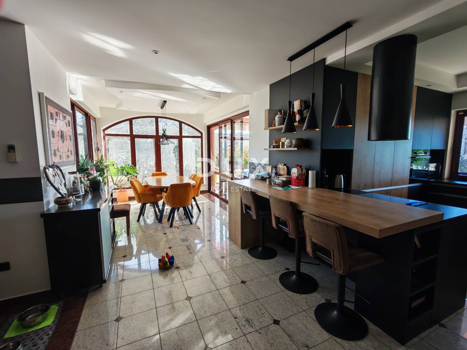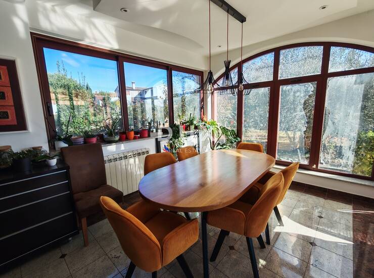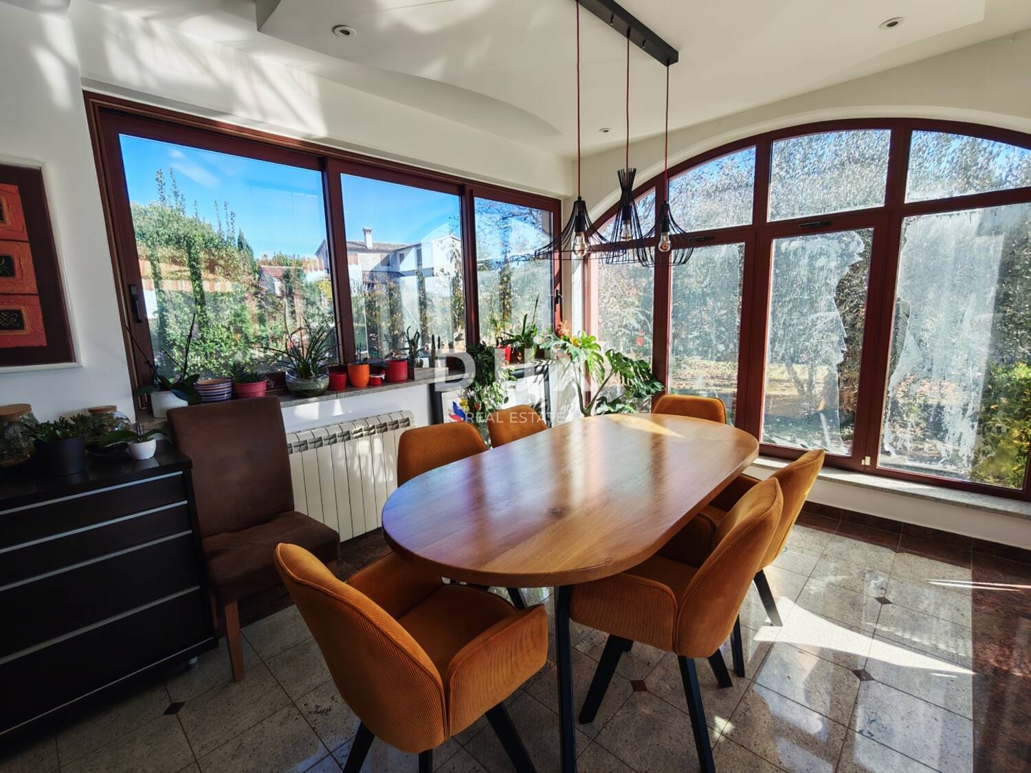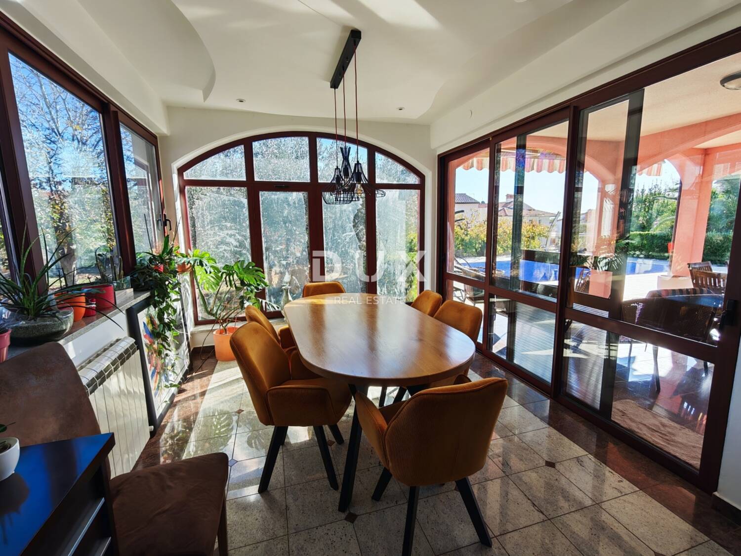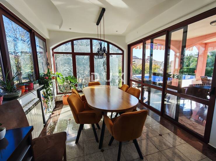 Iz dnevnog prostora izlazi se na natkrivenu terasu sa koje se pruža pogled na bazen površine 40 m2, okružen sunčalištem i uređenim zelenilom.