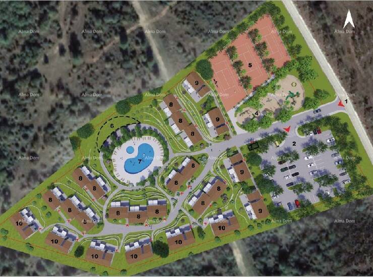 Predviđeno je naselje sa više smještajnih jedinica (120 ležaja ), posjeduje restoran, bazen, teniski tereni, dječje igralište, parkirna mjesta.