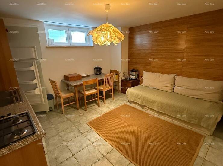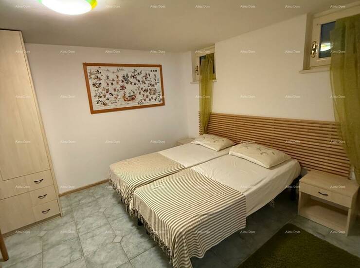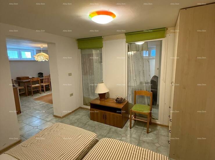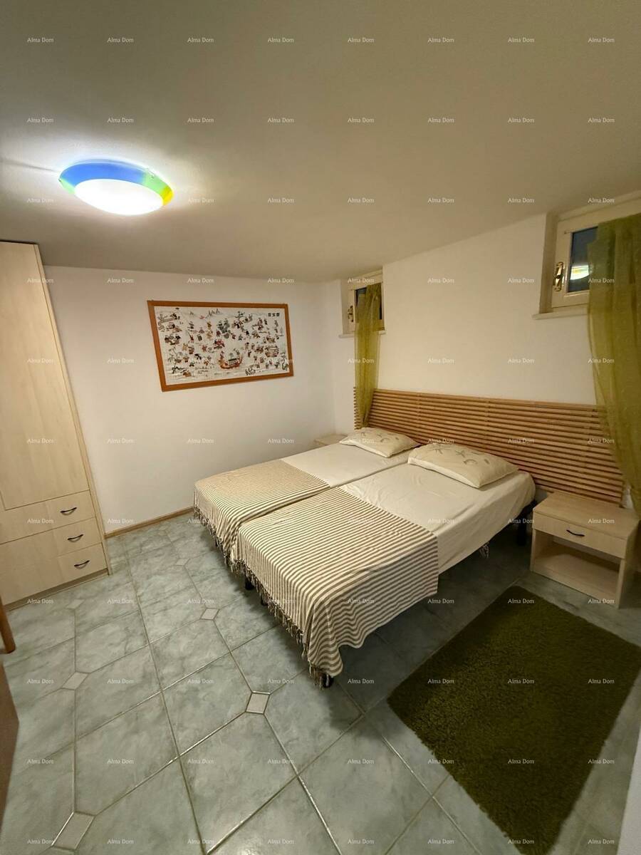 U prizemlju se nalazi zaseban ulaz, kupaonica, spavaća soba, kuhinja s blagovaonicom s izlazom na terasu, dnevni boravak te unutarnje stepenice koje vode na galeriju gdje se nalazi dodatna spavaća soba.