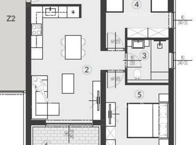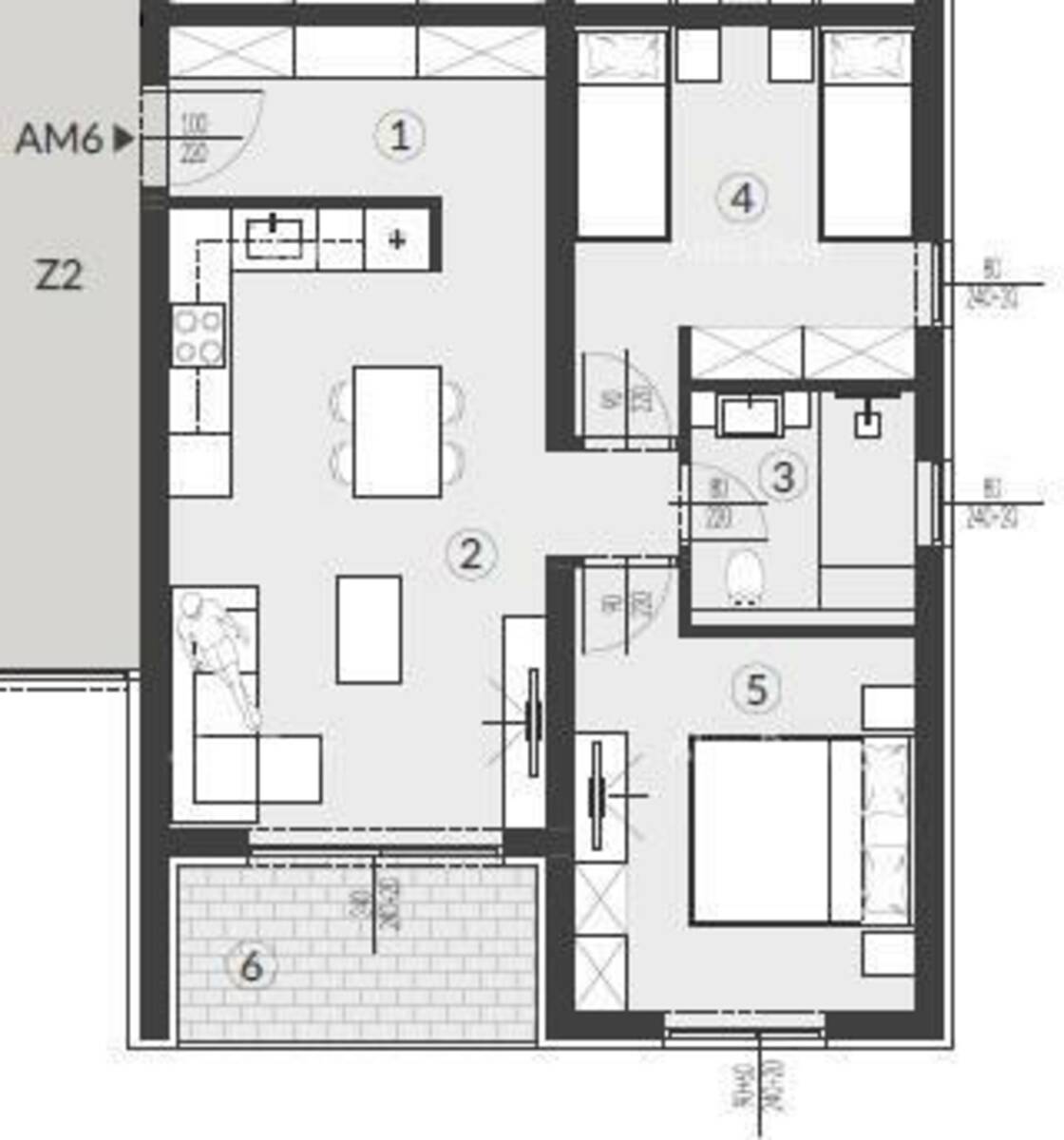 Stan AM6- nalazi se na 1.katu zgrade i sastoji od: hodika+garderoba, kupaonice, 2 spavaće sobe, dnevnog boravka s kuhinjom i blagavaonom i loggi-a.