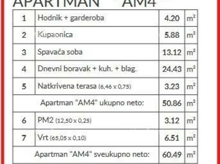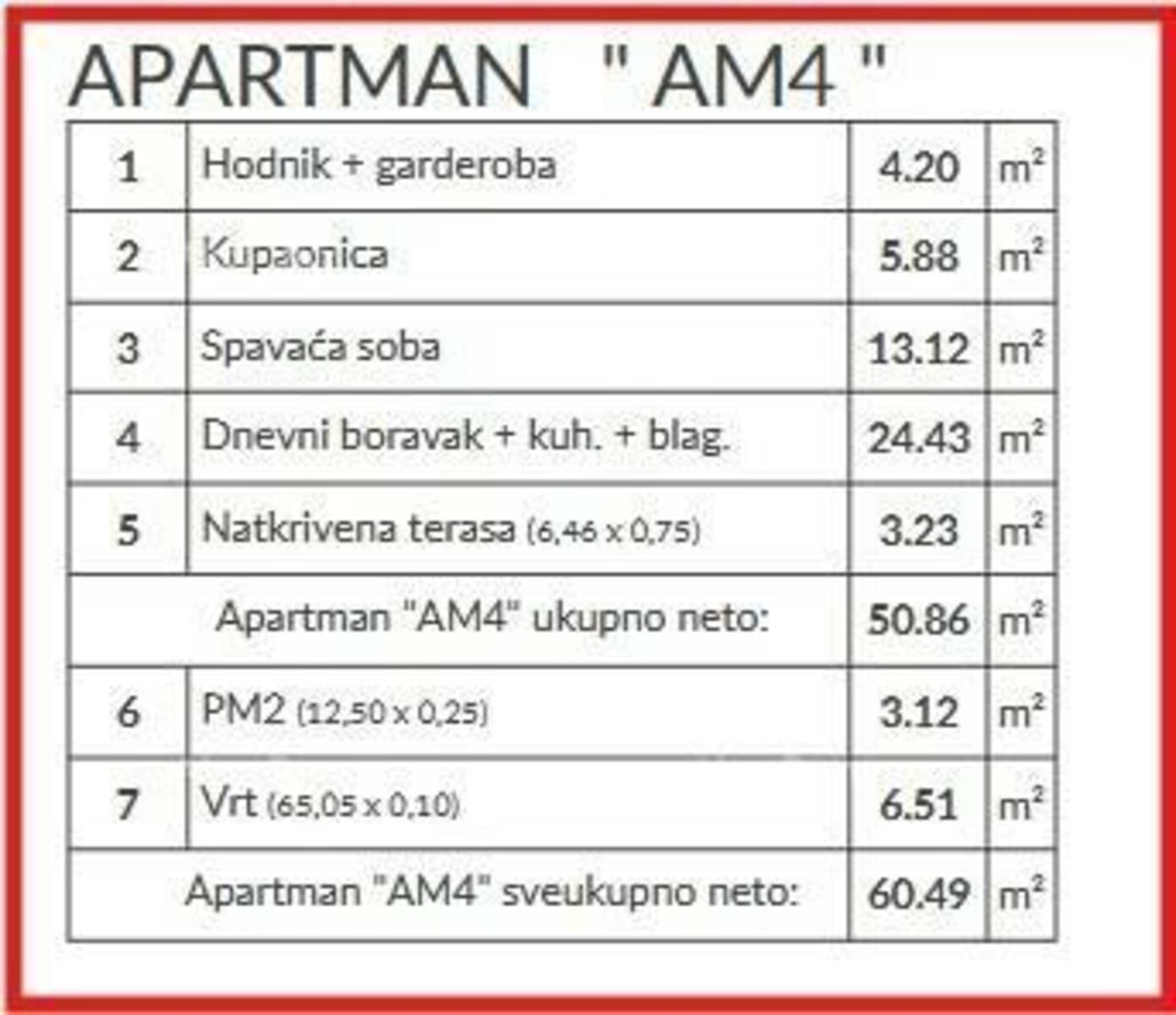 Stan AM4-unutrašnje površine 50.86 m2 nalazi se u prizemlju zgrade i sastoji od: hodika+garderoba, kupaonice, spavaće sobe, dnevnog boravka s kuhinjom i blagavaonom i natkrivene terase.