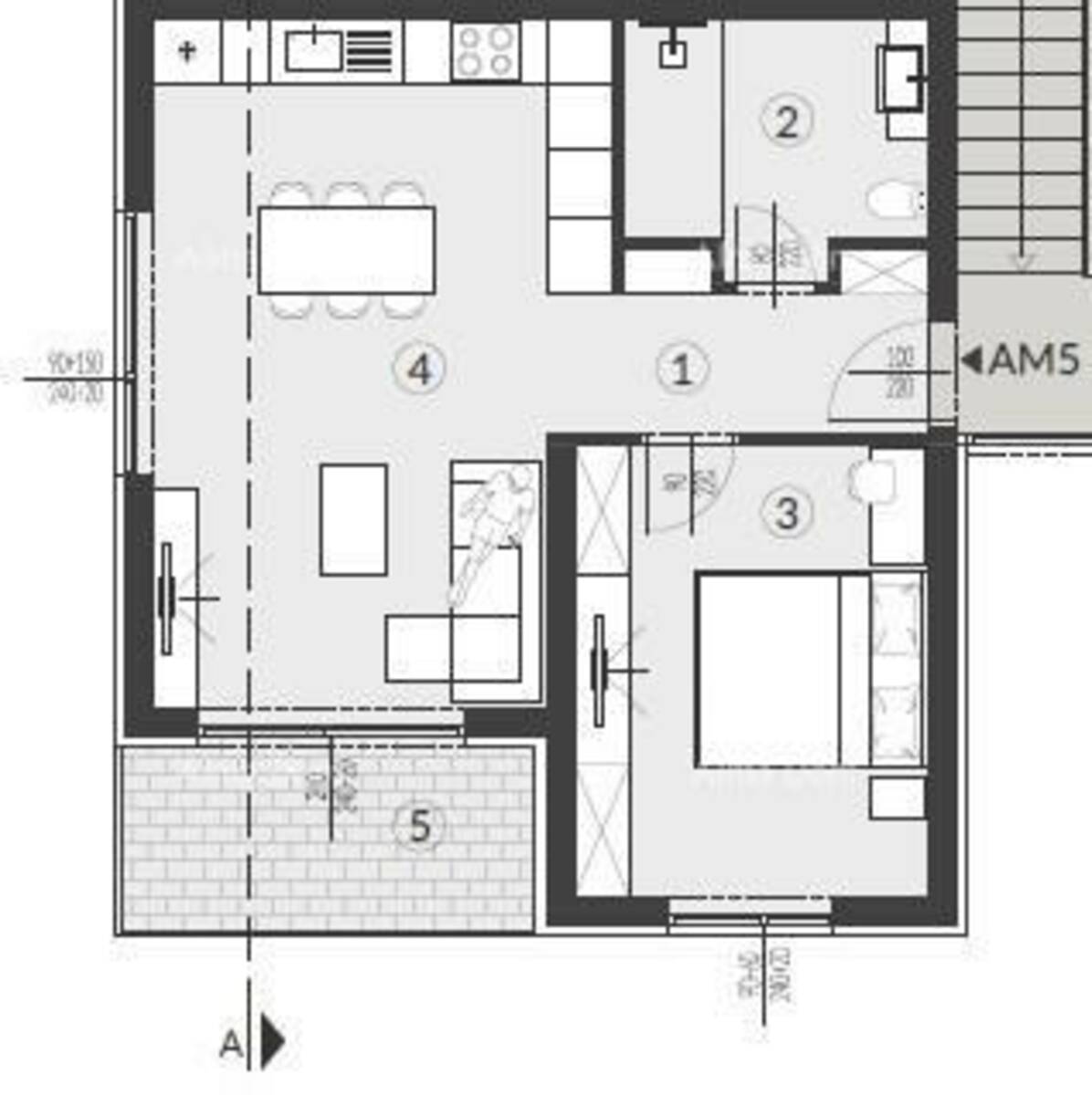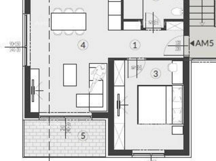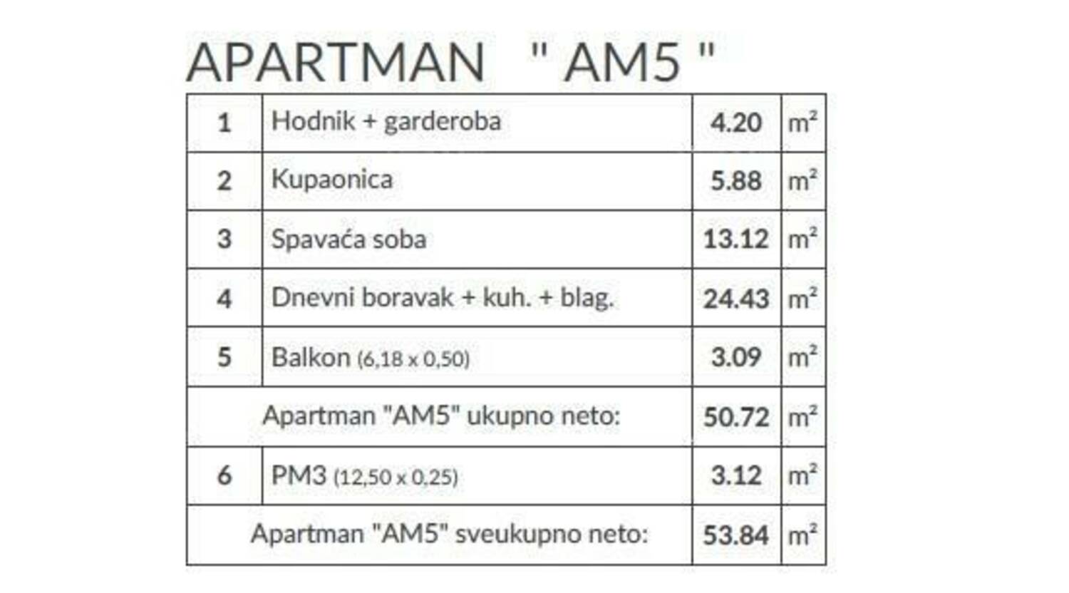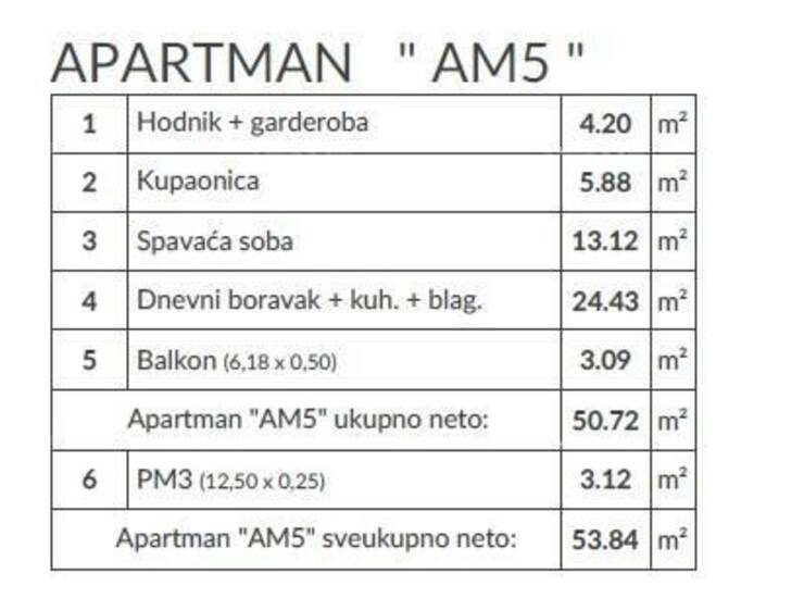 Stan AM5- nalazi se na 1.katu zgrade i sastoji od: hodika+garderoba, kupaonice, spavaće sobe, dnevnog boravka s kuhinjom i blagavaonom i balkona.