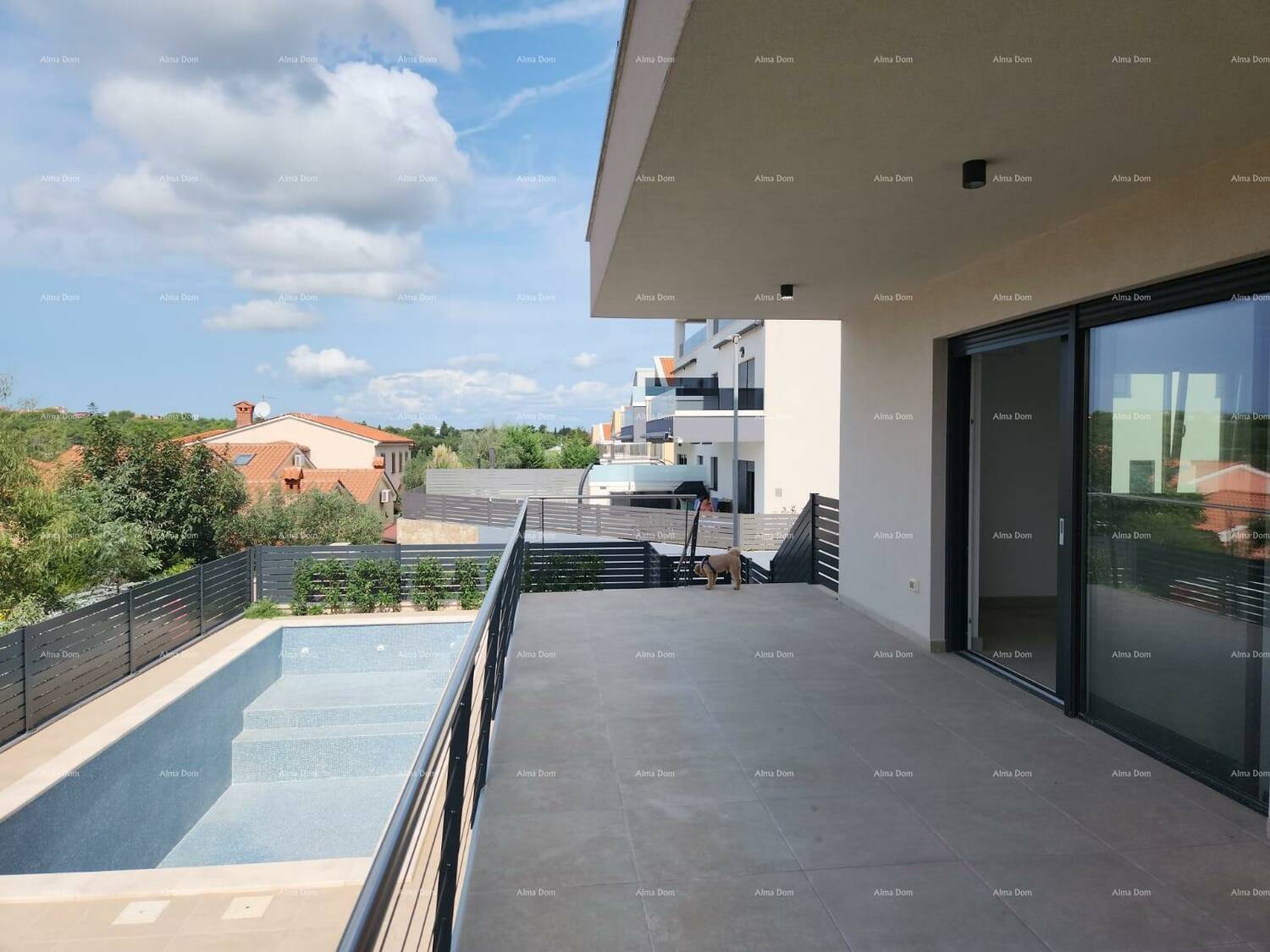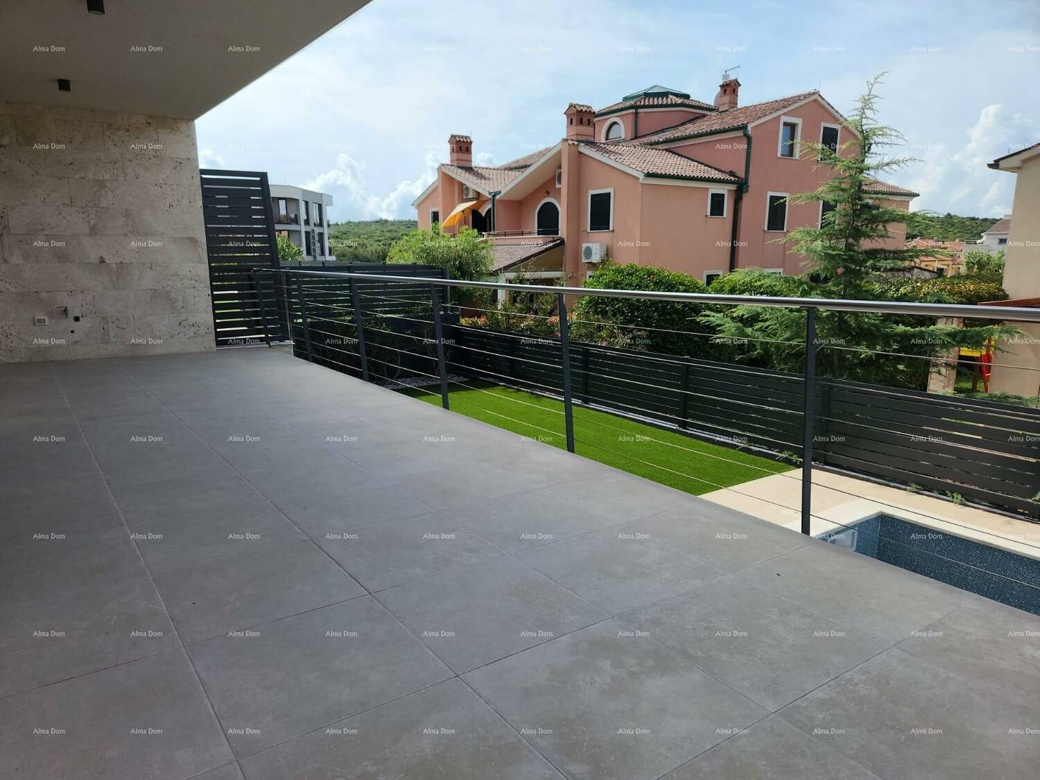 Na terasi su izvjedene sve potrebne instalacije za ugradnju ljetne kuhinji i jacuzzi. S terase niz stepenica je zona odmora s bazenom i sunčalištem. Kupca čeka odluka za obloge u bazenu -folija, pločice ili drugo.