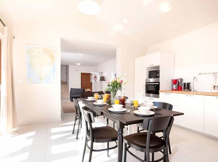Kuća bezvremenskog dizajna djelomično obložena kamenom se oblikovno i koloristički uklopa u naselje i krajolik. Koncipirana je kao jedna stambena jedinica koja se proteže kroz dvije elegantno namještene i kvalitetno opremljene etaže funkcionalnog tlocrta.