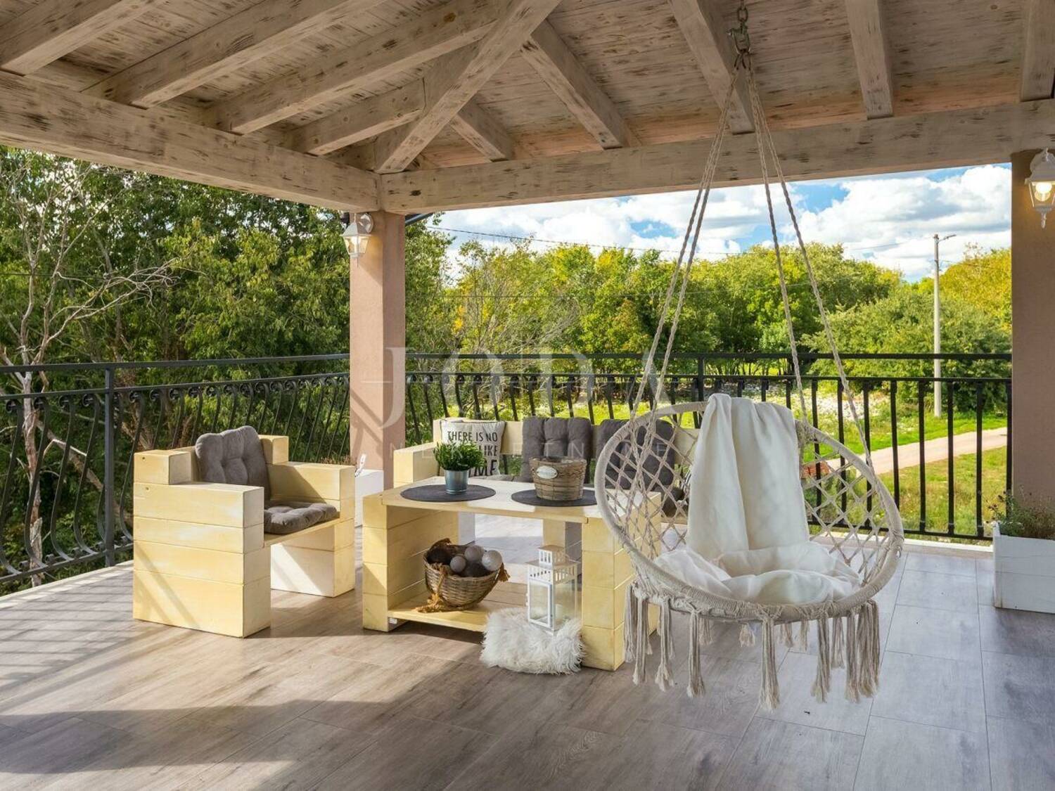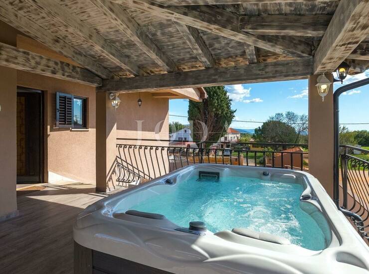 Posebnost gornjeg kata je svakako velika natkrivena terasa na kojoj se nalazi jacuzzi i sjedeća garnitura za uživanje u toplim ljetnim mjesecima.