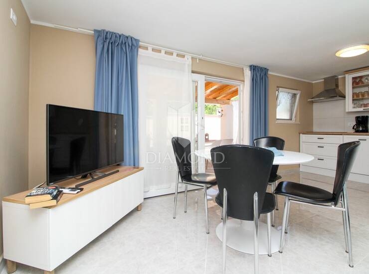 Ova prekrasna kuća za odmor koncipirana je kao katnica sa dvije zasebne stambene jedinice. U suterenu je smješten manji apartman površine 48 m2 koji se sastoji od kuhinje, blagovaonice, spavaće sobe i kupaonice. Tu se nalazi i natkrivena terasa za uživanje u vanjskom prostoru tijekom ljetnih mjeseci. Na katu je veći apartman kvadrature 80 m2 koji obuhvaća kuhinju, blagovaonicu i dnevni boravak, dvije spavaće sobe i kupaonicu. Kompletna kuća je na novo adaptirana te funkcionalno opremljena kvalitetnim novim namještajem. Oba apartmana su klimatizirani te postoji i mogućnost centralnog grijanja.