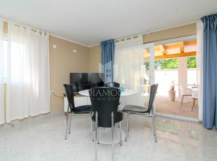 Prostrana okućnica od 850 m2 osigurava natkriveni parking, lijepe zelene površine sa dječjim igralištem a tu se nalazi i lijepi bazen veličine 32 m2 sa slanom vodom i uređenim sunčalištem. Na okućnici i bazenu osigurana je potpuna privatnost što nekretninu čini ugodnom za boravak i odmor.