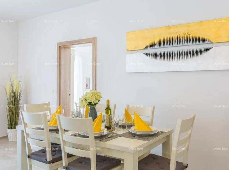 U prizemlju se nalazi ulazni hodnik, spavaća soba, kupaonica, kuhinja s blagavaonicom te dnevnim boravkom i terasom koja je natrkivena.