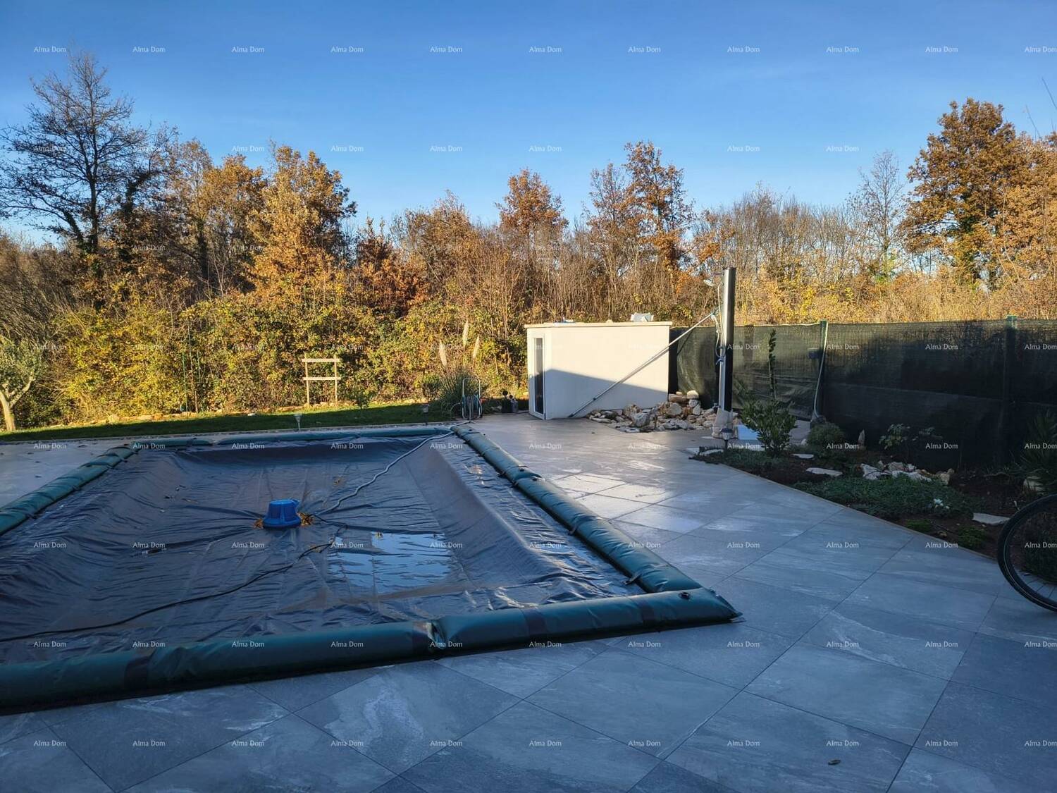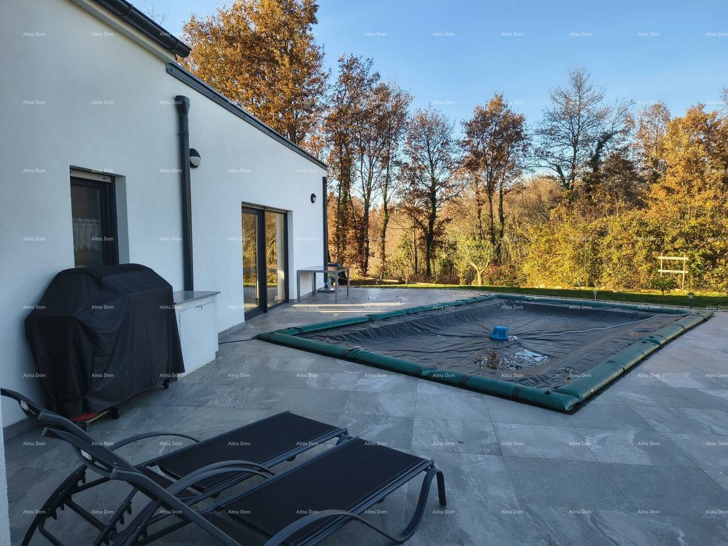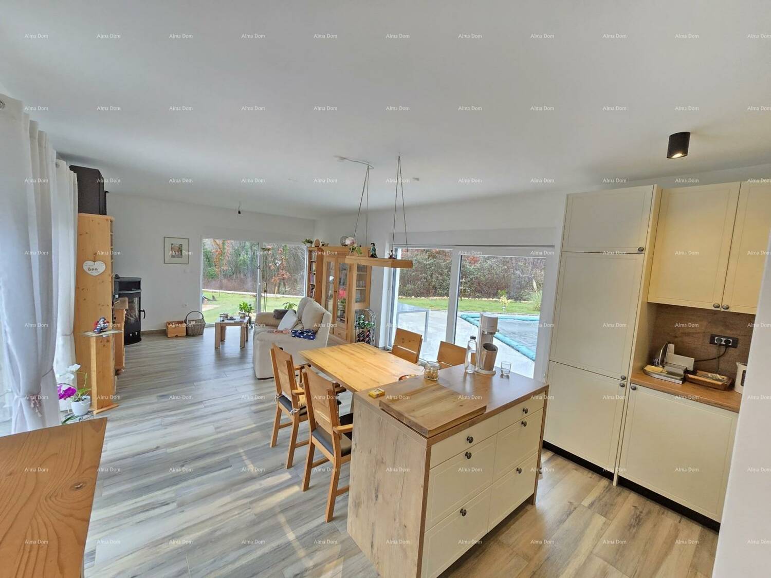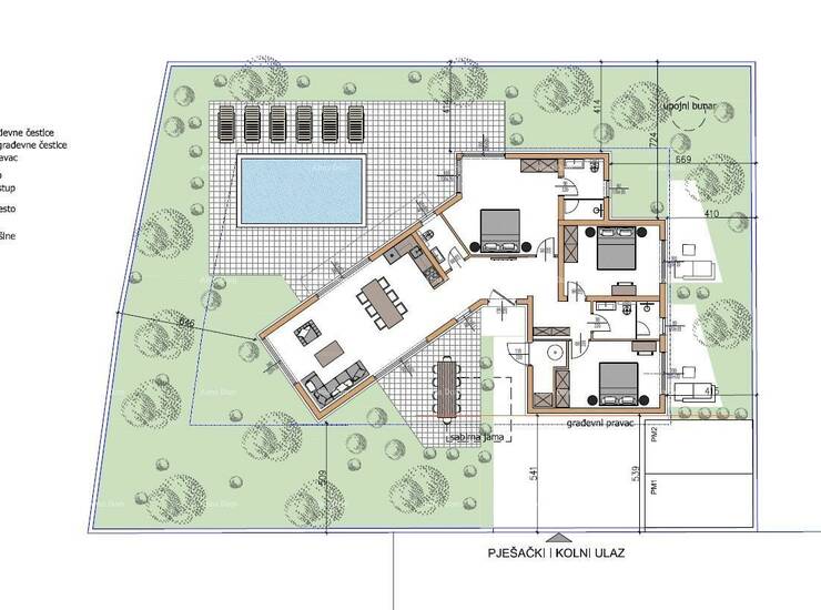 U ponudi je samostojeća prizemnica s bazenom koja se sastoji od ulaznog hodnika, velike spavaće sobe s kupaonicom, dvije manje spavaće sobe koje djele kupaonicu, toilette, kuhinja s blagavaonicom te dnevnim boravkom. Iz dnevnog boravka izlaz na dvije velike terase te bazen od 20 m2. Dnevni boravak svijetao i prozračan s velikim staklenim površinama.