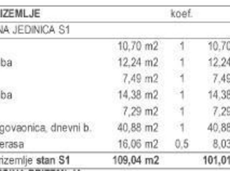 Vila površine 109.04 m2 (neto površine 101,01 m2) sastoji se od prizemlja i hodnik, 2 kupaone, 2 spavaće sobe, kuhinju, prostrani dnevni boravak i blagavaonu i natkrivenu terasu.