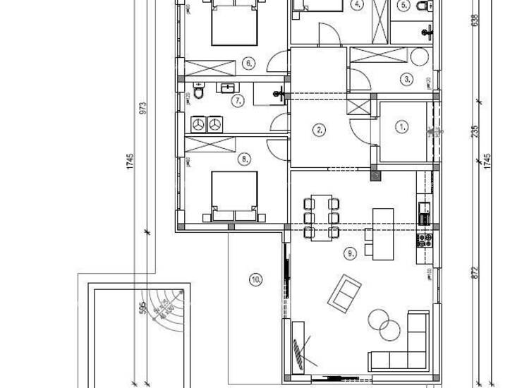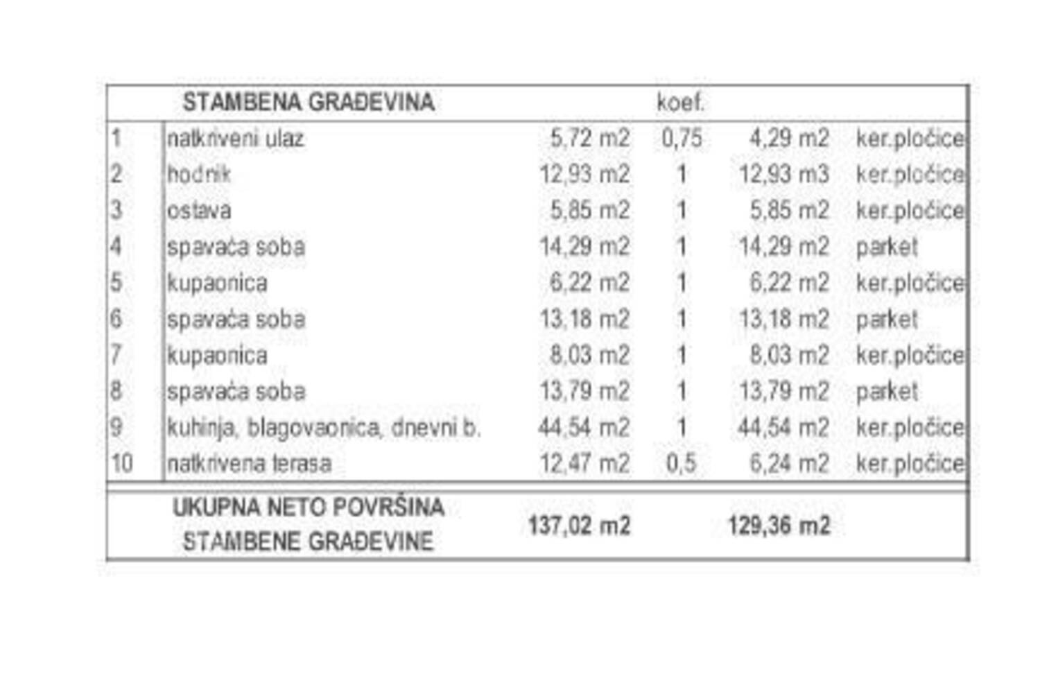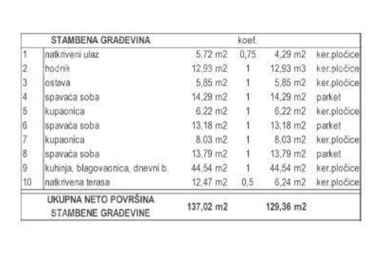 Vila površine 137.02 m2 (neto površine 129,36 m2) sastoji se od prizemlja i uključuje: natkriveni ulaz, hodnik, 2 kupaone, 3 spavaće sobe, kuhinju, prostrani dnevni boravak i blagovaonu i natkrivenu terasu.