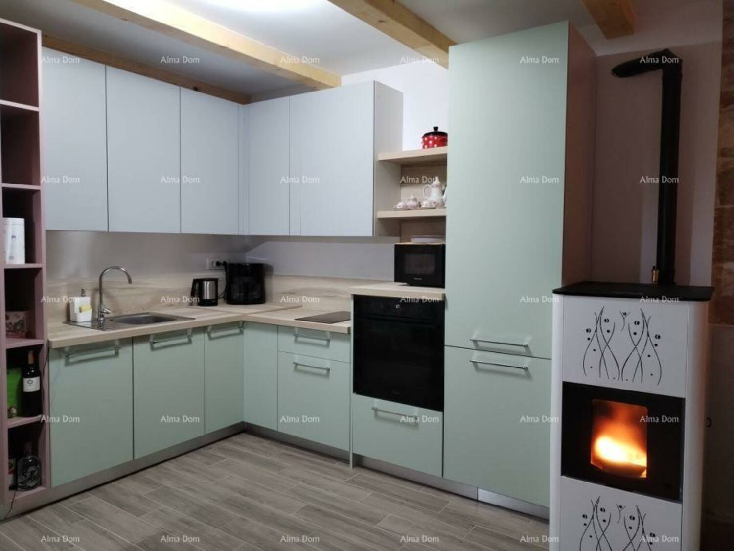 Grijanje je riješeno putem podnog grijanja, peći na pelete i klima uređaja.