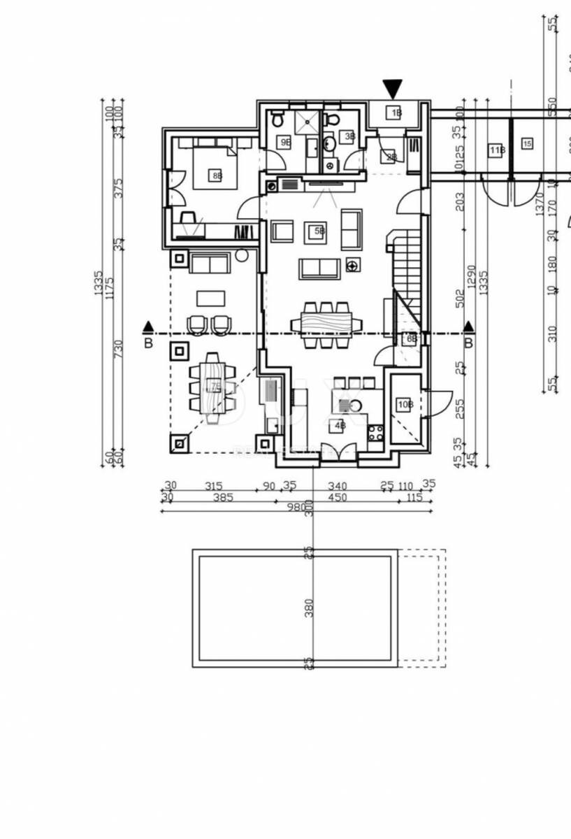 Prizemlje – prostrani dnevni boravak povezan s kuhinjom i blagovaonicom, iz kojeg se izlazi na natkrivenu terasu idealnu za opuštanje uz bazen. Na ovoj etaži nalazi se i jedna spavaća soba s vlastitom kupaonicom te dodatni gostinjski WC.