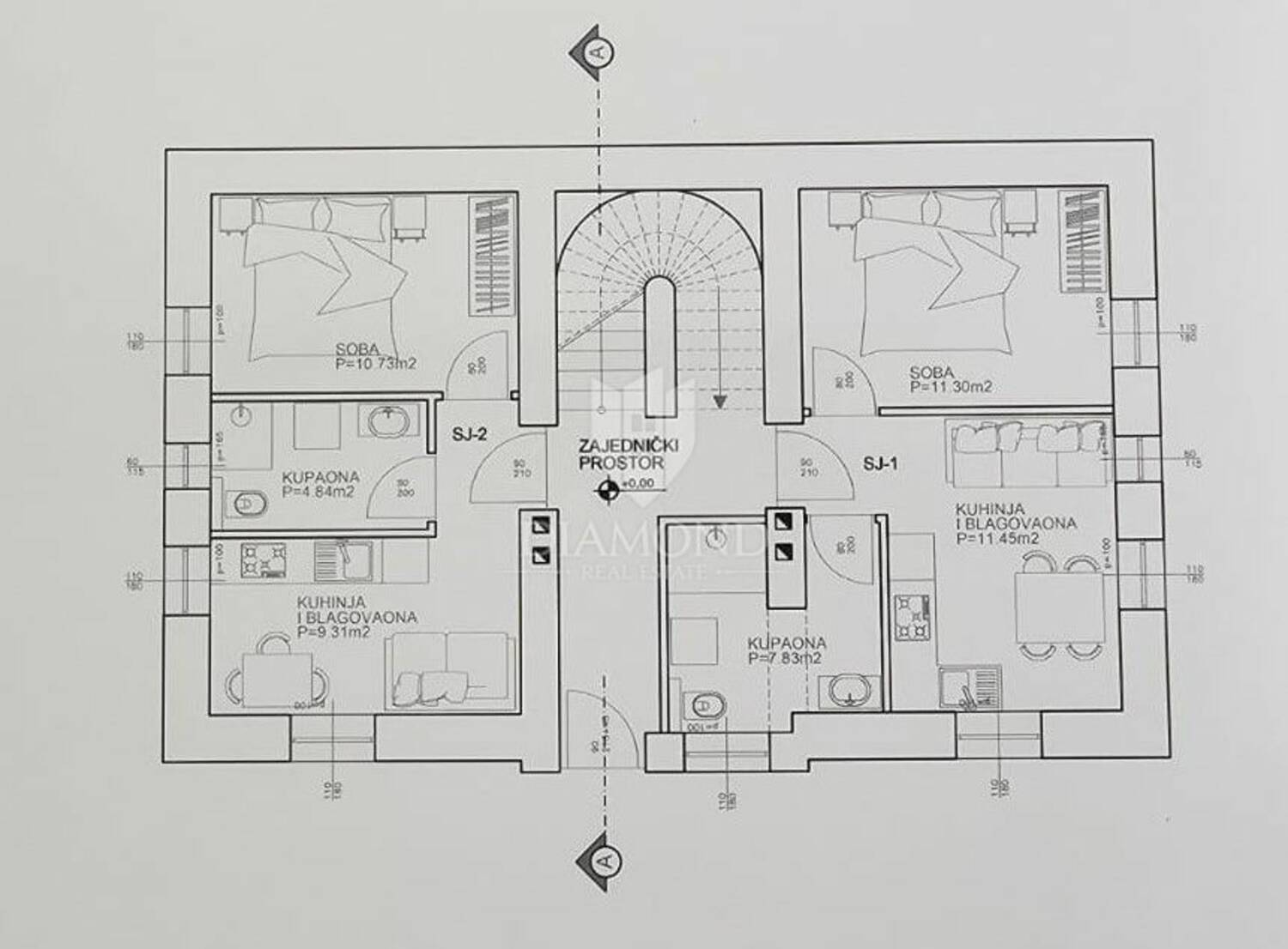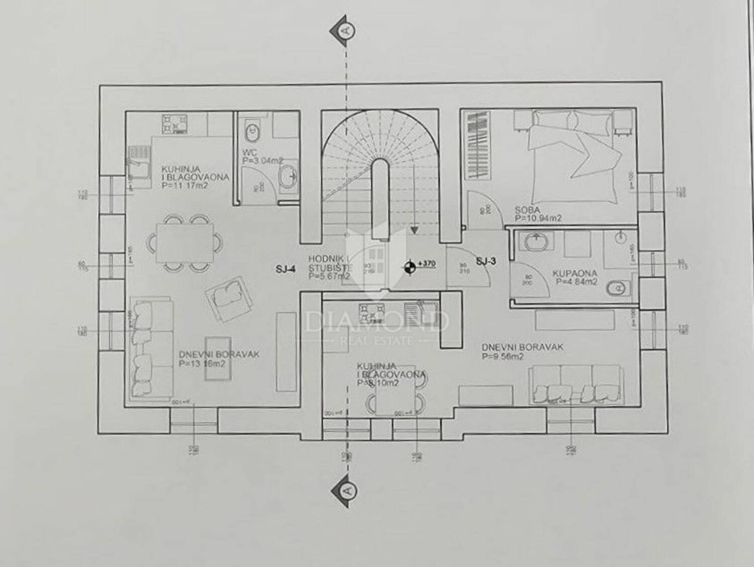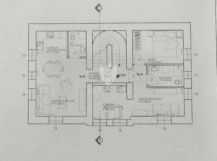 Četvrta stambena jedinica koncipirana je kao prostrani dvoetažni stan koji se proteže kroz prvi kat i potkrovlje. Na donjoj etaži nalazit će se kuhinja, blagovaonica, dnevni boravak i kupaonica, dok su u potkrovlju predviđene 2 spavaće sobe, 2 kupaonice, garderoba i ostava, što pruža dodatni komfor i mogućnost obiteljskog stanovanja.