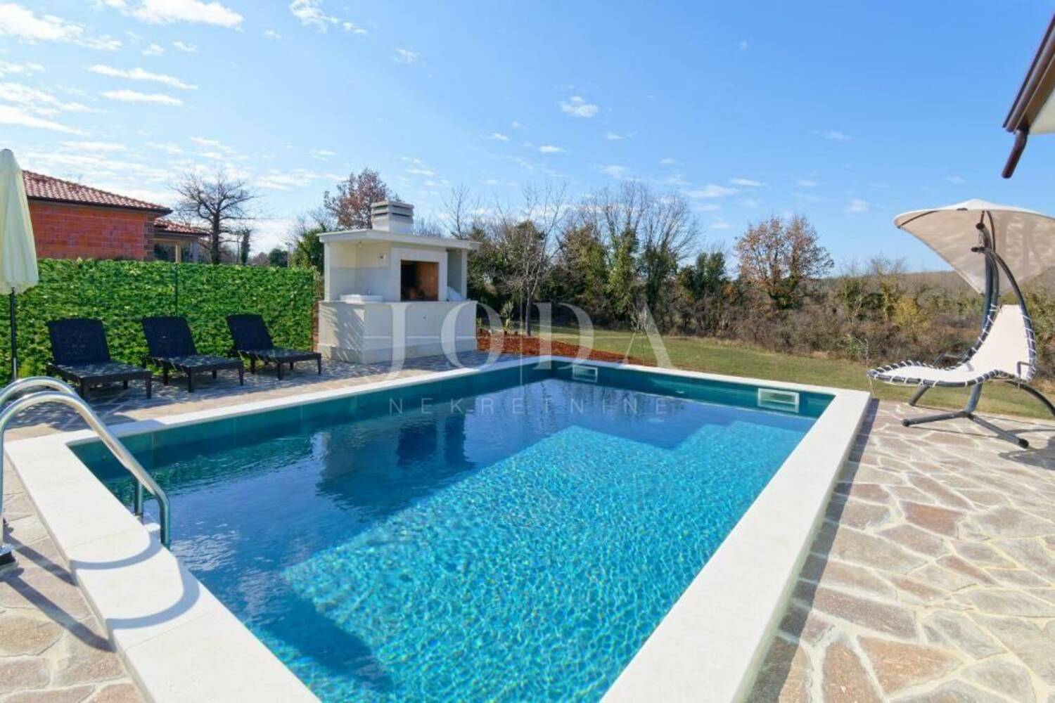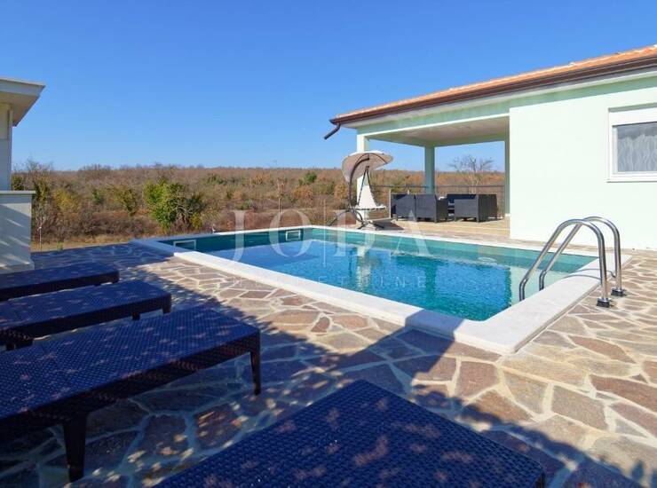 Iz dnevnog boravka izlazi se na veliku natkrivenu terasu i bazen sa sunčalištem.
