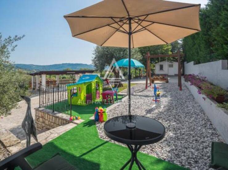 Jedan dio kuće čini prekrasno obnovljeni kameni segment koji se proteže kroz prizemlje i prvi kat. Pažljivo je renoviran kako bi se zadržao autentičan istarski karakter, a interijer odiše toplinom drvenih detalja i svježinom prirodnog kamena. Ova jedinica uključuje svijetli dnevni boravak, kuhinju s blagovaonicom, gostinjski toalet, tri spavaće sobe, kupaonicu i veliku natkrivenu terasu koja vodi na popločano dvorište s direktnim pristupom bazenu.
