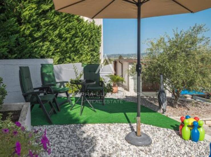 Okućnica je ograđena i lijepo uređena mediteranskim biljem, stvarajući miran vanjski prostor s garažom, spremištem i dječjim igralištem. Raspored, v