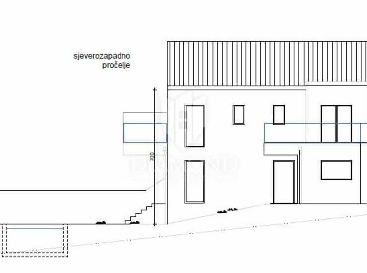 Kuća je ukupne površine od 153 m2 a proteže se na dvije etaže. U prizemlju se nalazi dnevni boravak sa kuhinjom i blagovaonicom, 1 spavaća soba sa vlastitom kupaonicom, ostava, wc i vanjsko spremište. Iz dnevnog boravka izlazi se na natkrivenu terasu sa koje se pristupa na uređenu okućnicu, bazen i sunčalište. Na prvi kat se pristupa unutarnjim stepenicama na kojem se nalazi predsoblje i 2 spavaće sobe svaka sa svojim vlastitim kupaonicama i terasama. Kući pripada i tavan ukupne površine 28 m2 od čega je 9 m2 visine iznad 2m što ovoj kući daje dodatni prostor za korištenje. Grijanje je podno na dizalicu topline a hlađenje na klima uređaje. Pripada joj i uređena okućnica od 80 m2 na kojoj su smještena 2 parkirna mjesta.