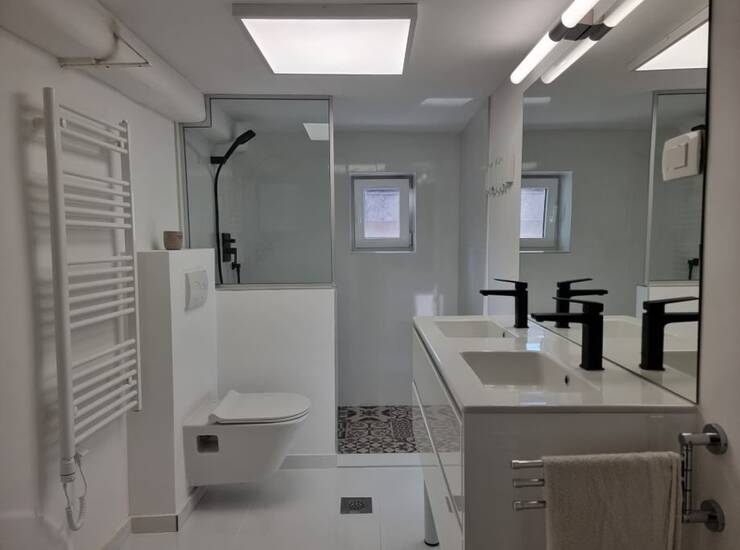 Stan je za sada djelomično adaptiran, odnosno samo donja etaža je adaptirana kvalitetnim materijalima, dok gornja koja je u potkrovlju nije.