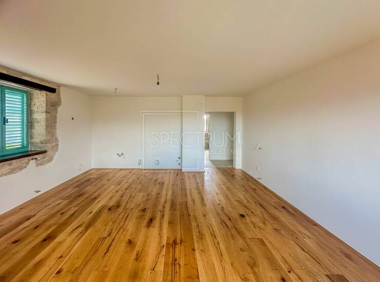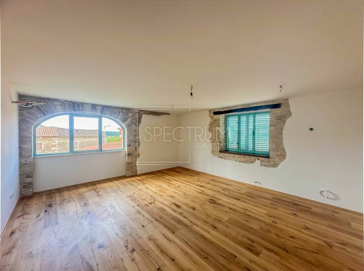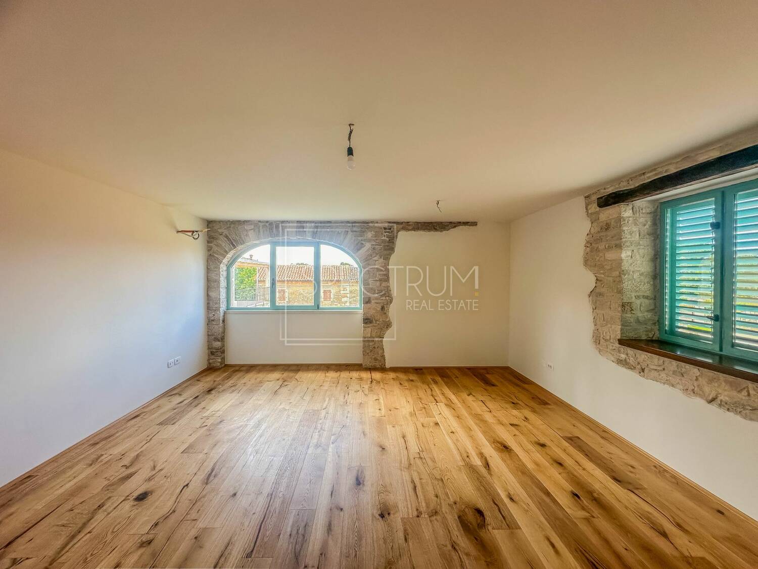 Stan se nalazi na 1.katu nedavno renovirane stambene zgrade. Površina stana iznosi 61.74 m2. Stan se sastoji od open space dnevnog boravka sa kuhinjom i blagovaonicom, spavaće sobe, još jedne sobe koja može poslužiti kao dodatna spavaća soba, kupaonice i hodnika. Iz dnevnog boravka se izlazi na terasu sa koje se pruža pogled na Buje i na more. Stan se grije putem klima uređaja, postoji mogućnost i ugradnje peći na drva ili pelete, a napravljena je i priprema za centralno grijanje. Stan je renoviran kvalitetnim materijalima, kombinirajući moderne elemente sa tradicionalnim elementima, poput kamenih zidova. Stan ima i vlastito parkirno mjesto koje se nalazi odmah pored ulaza u samu zgradu.