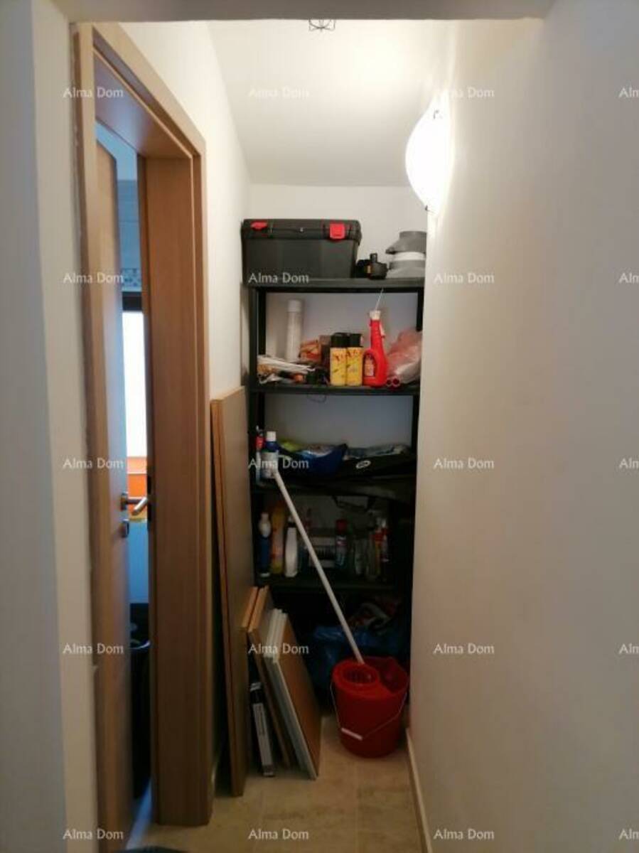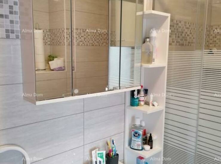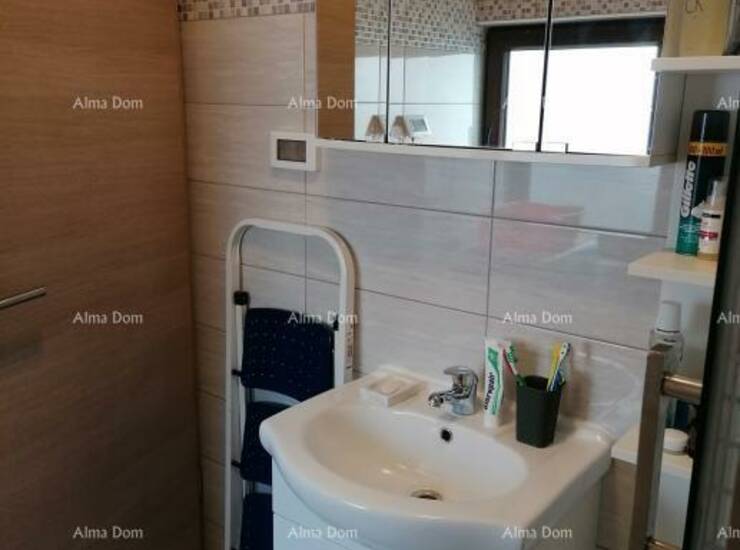 Smješten na prvom katu stambene zgrade, stan se prostire na 45 m2 uključujući prostrani dnevni boravak, kuhinju s blagovaonicom, dvije spavaće sobe, hodnik i kupaonicu. Stan je opremljen klima uređajem za grijanje, ali postoji i mogućnost grijanja na pelete ili drva zahvaljujući prisutnom dimnjaku.